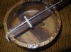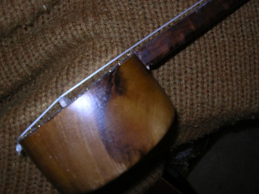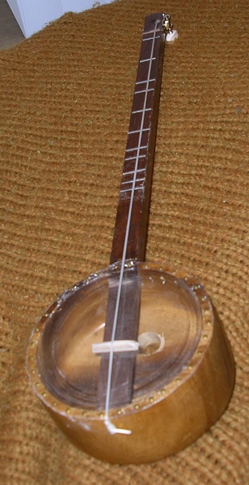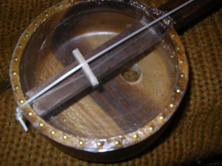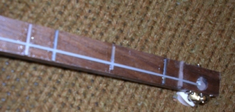 The frets are cut from discarded windhield wiper reinforcing strips, and spaced for a plain 8-note scale, no sharps, no flats.