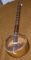 A nice piece of repurposed maple or (in this case) walnut for the neck, a single guitar peg, and a chunk of weed trimmer for the string.