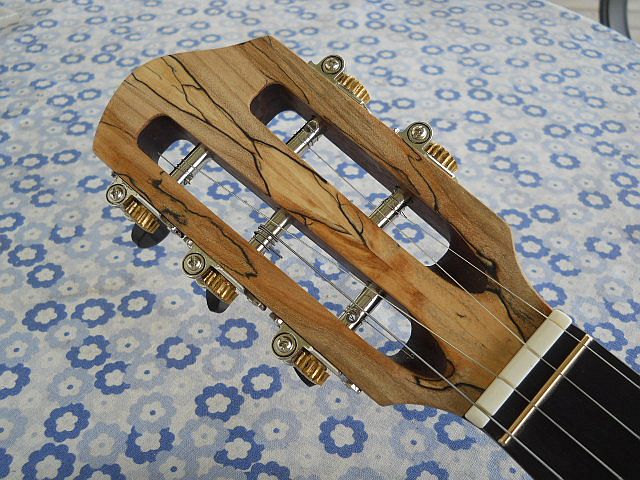 The string spacer which replaces the nut is cut with wide slots so nylons will fit without widening the slots, and the bridge has my "V" slots which will work identically with steel or nylon. Even the tailpiece has been specified as dual-purpose, accomodating loop end steel or nylon strings equally well. If you look very closely at the fifth string spike you can see that the fret board is slightly "divoted" uder the fifth fret spike to allow Nylguts to be used under the spike head. I've covered all the bases on this one!