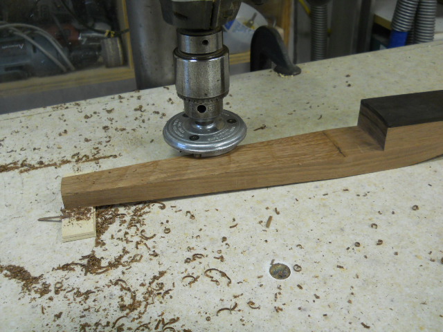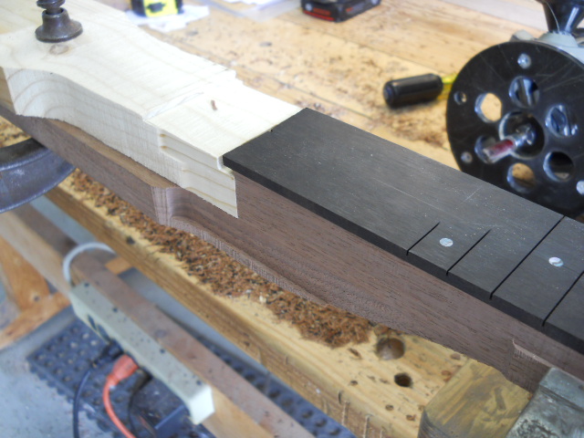 Having attempted to teach a few guys how to build a banjo, with mixed results, I share your concern about fitting the heel being one of the more difficult aspects of banjo building. I've used a similar "neck-through" or "fat dowel stick" concept on most of my little cheap PETE-headed banjos, with the difference that neck alignment (in the yaw angle) was accomplished by screwing the neck to the extended dowel stick with two screws. Alignment is checked and set before the second screw is pilot-drilled and inserted. However, your design has a very obvious aesthetic advantage over mine (in plain English, yours is beautiful and mine is so ugly it's cute). I am currently working on a 3rd-generation PETE-headed banjo with a rectangular rim with chamfered corners, and I believe you have convinced me to try this glued-up extension for the dowel stick as well as the slot in the tailpiece end of the rim for neck angle (pitch) adjustment.