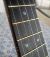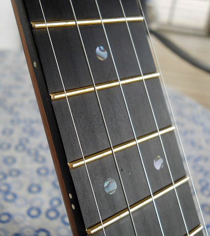 3/16” ebony fretboard with small abalone position markers and plastic side dots