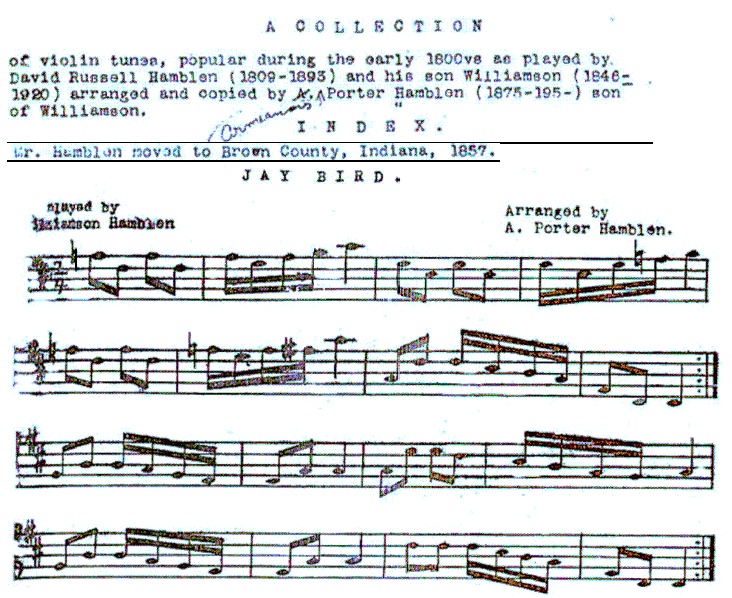 Jay Bird from the Hamblen Collection of tunes played by David Russell Hamblen (1809-1893 of Cumberland Gap, Lee County Virginia; moved to Brown County Indiana, 1857) and his son Williamson (1848-1920) and copied by Armanis [?; hand written addition difficult to read] Porter Hamblen (1875-195-) son of Williamson.