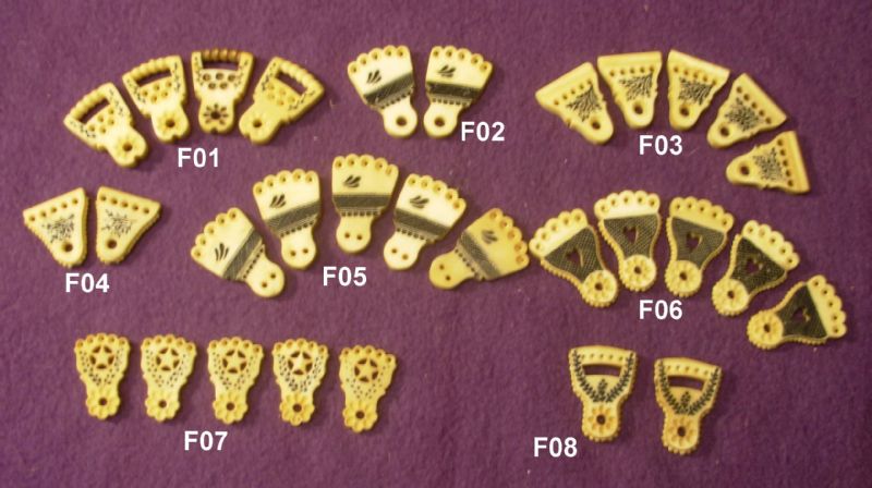 These tailpieces are reproduced in a hard nylon, which is snow white. I hand-tint the black highlights and tint the tailpieces to approximate a color between bone (off-white) and near-yellow (ivoroid). All are hand-finished, and no two are exactly alike. All are suitable for nylon or gut strings. All are priced at $25, which includes a tailpiece bolt for all except tailpiece F05, which is hung with gut or wire. Also posted in this ad are some images of tailpieces from old (pre-1900) catalogs, FYI.
