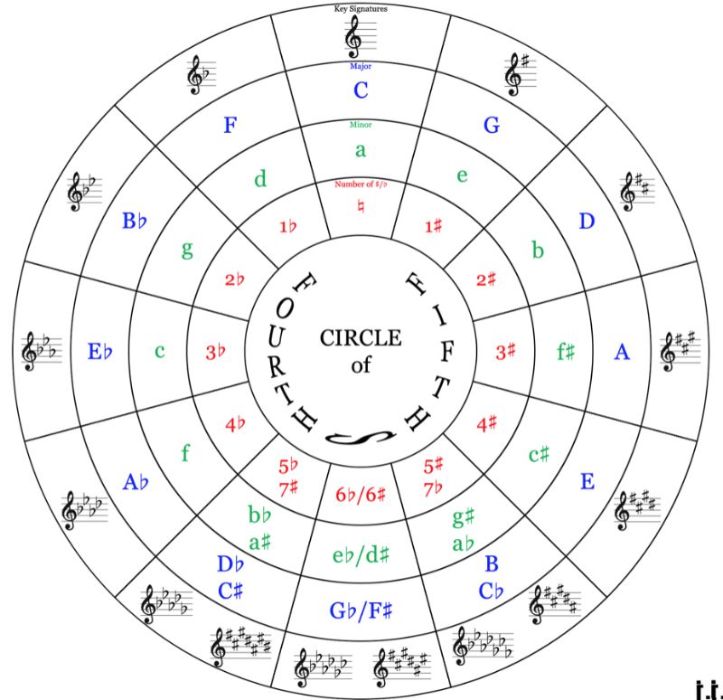 Here's something that I find really cool about the Circle of Fifths: About 2500 years ago, the Greeks got excited about the integer frequency ratios of nice sounding intervals. An octave is a factor of 2, and a fifth is a factor of 3/2. They occur naturally in the vibrations of thin strings, air in straight pipes, and in our singing voices. And I've read that animals can be taught to recognize those. If you go around the Circle of Fifths by increasing by factors of 3/2, i.e., 12 steps, you don't actually get to the seventh octave of the starting pitch. The overshoot of about 1% is called the Pythagorean comma -- because those guys knew about it! Supposedly it contributed to their thinking about "irrational" numbers (which also figure in the eponymous Theorem). Of course, the circle closes if you use the equal temperament version of a 5th.