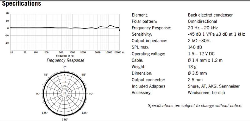 For example, Meyers makes The Feather... a little rig with a small condenser capsule for banjo, dobro etc... but I could not find any technical specs like frequency response graph, max. SPL, sensitivity etc., whereas my earpiece mic for singling publishes their specs.