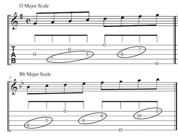 As an introduction to these new lessons, here are two simple fingerings for the G and Bb Major Scales. Both G and Bb Major scales are easily played by grouping two-note fingerings shown in the tablature.