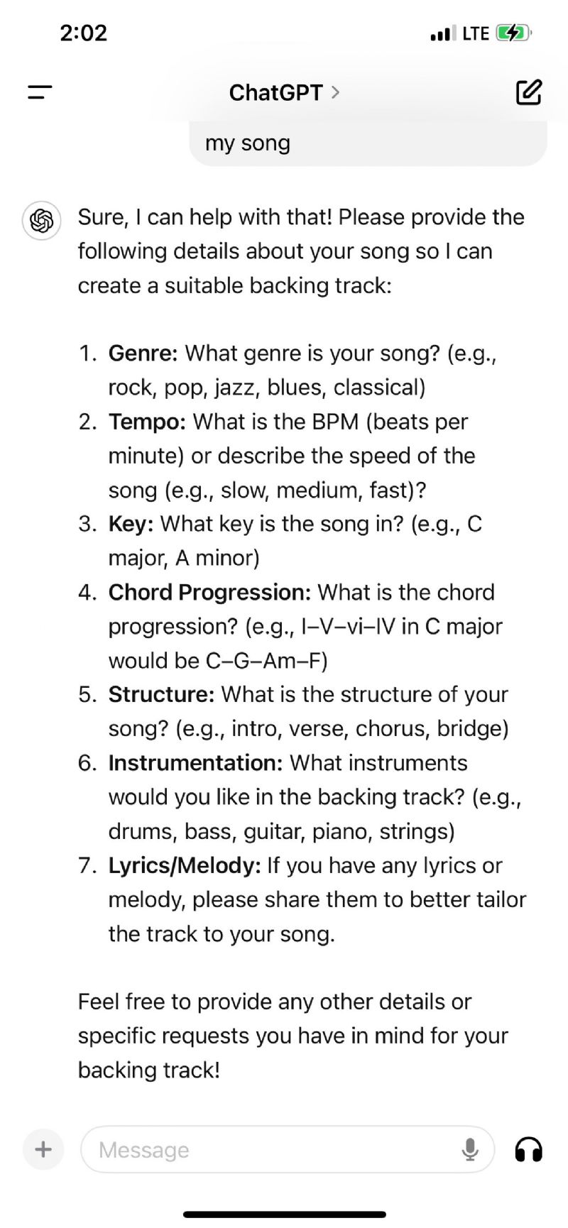 I went to ChatGPT and asked: can you add backing tracks to my song. The attached shows the reply I received. I did not respond. Brad
