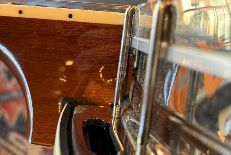To be clear what you're seeing: The light spot at the end of the heel is sunlight on the carpet at my feet. The banjo was in my lap in playing position. I should not see the floor through the banjo. That's a gap of a sixteenth to an eighth of an inch between the top of the heel and the tone ring. You can see how set back the ring skirt is from the wood band of the rim. It was that way all around. That is, the ring was not at or overhanging the band at the tail end.