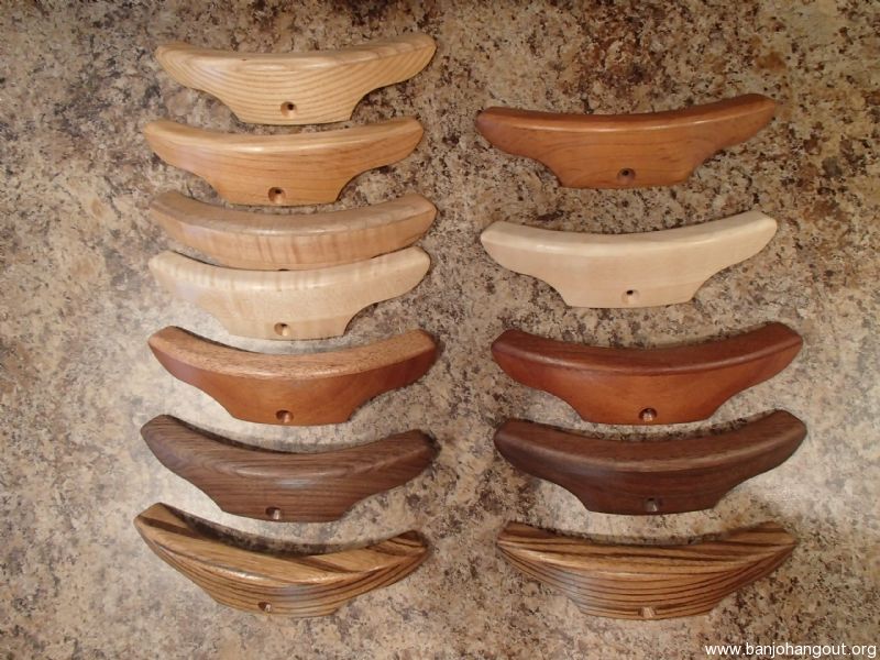 These are Romero-style wood armrests. 11" are on the left and 12" on the right. Top to bottom 11" are ash, ($30), cherry ($30), dark curly maple and light curly maple ($35), mahogany ($30), walnut ($35), and zebrawood ($40). 12" are the same prices and woods except there is only light curly maple for $35 in 12" and no ash currently. All of the armrests have a Tru Oil finish. I can make larger quantities or other sizes or woods, or unfinished armrests, please inquire. I will need to know the hook spacing of your banjo to make the brass clamp, and to know if you want brass or stainless steel for the machine screw that connects the armrest to the clamp.