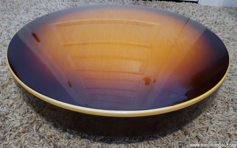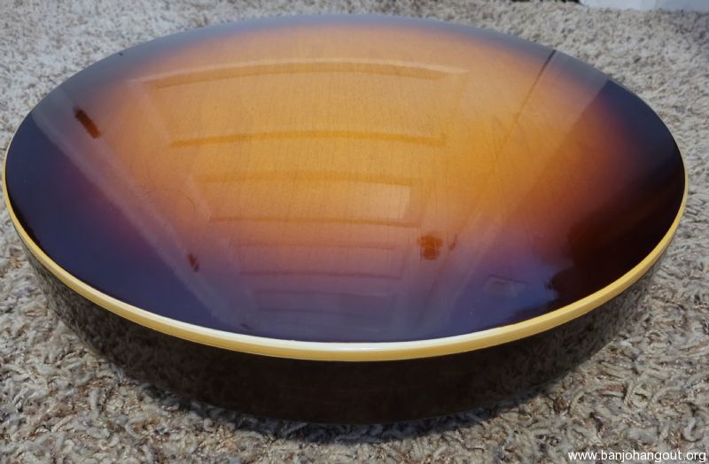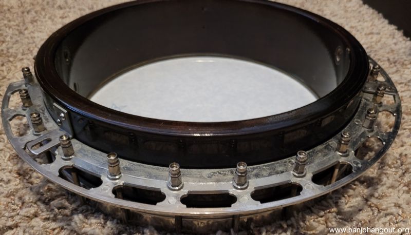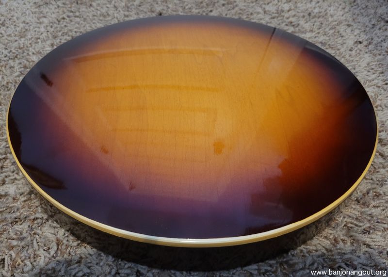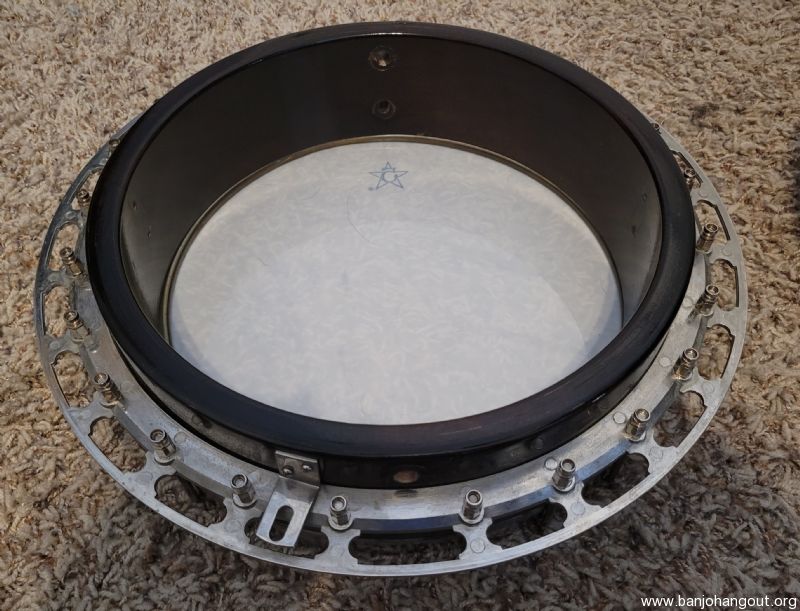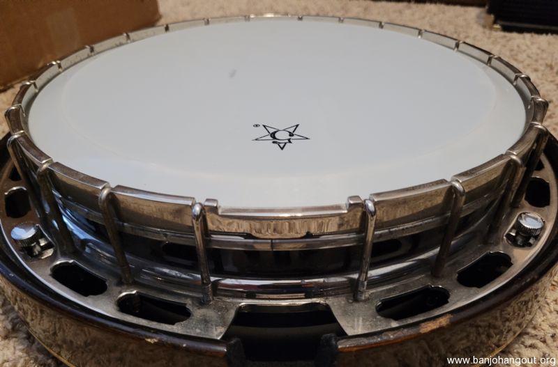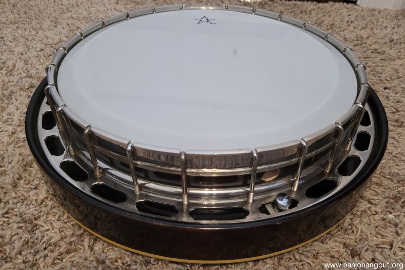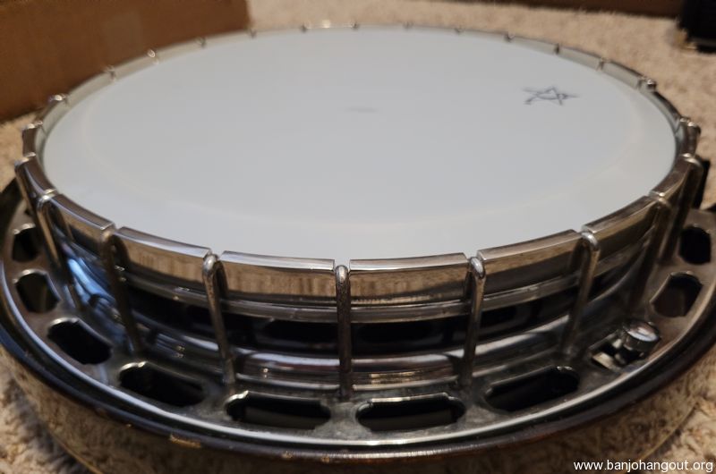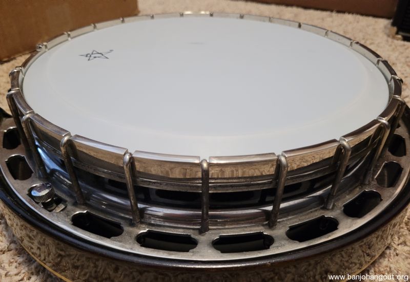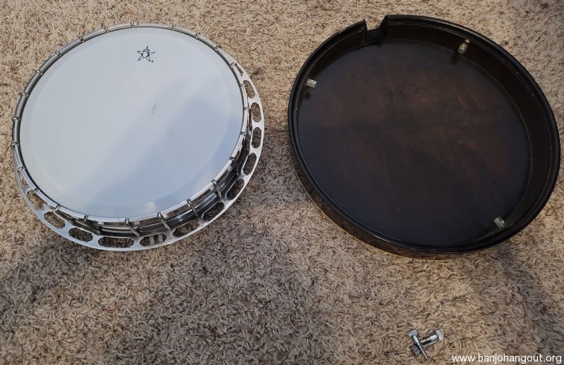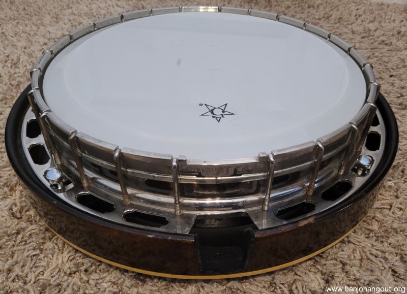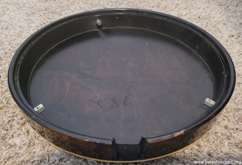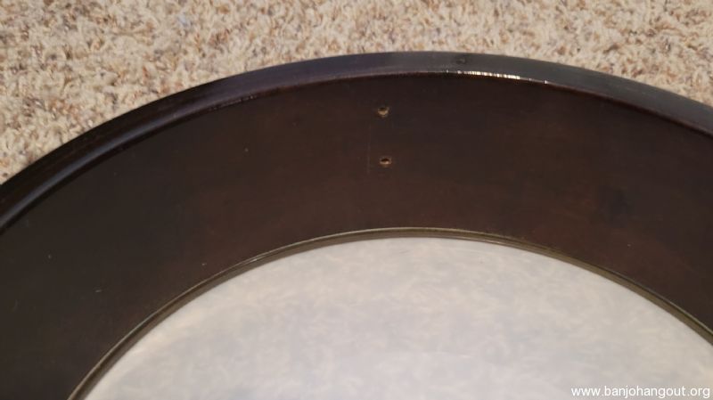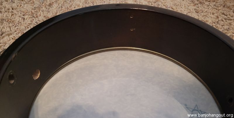 In great shape overall, some patina on the tension hooks. Someone put a pickup in here at some point. There is a 1/4 inch hole on the rim where the jack was and four small screw holes inside the rim where brackets for the pickup were.