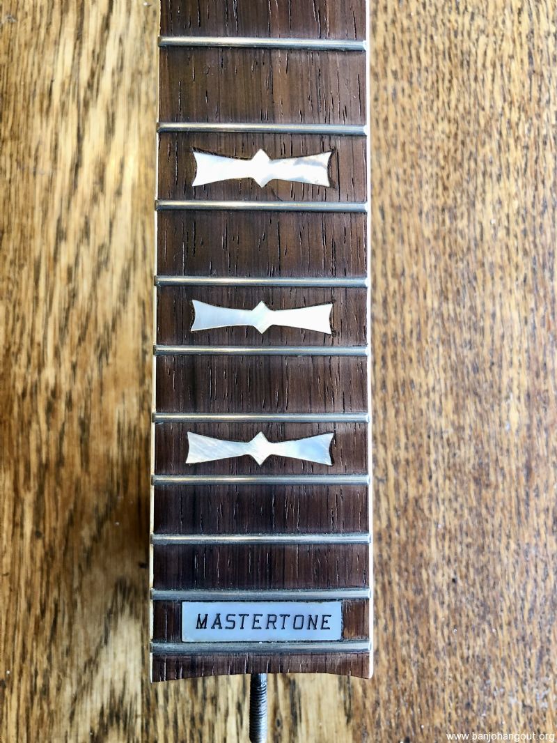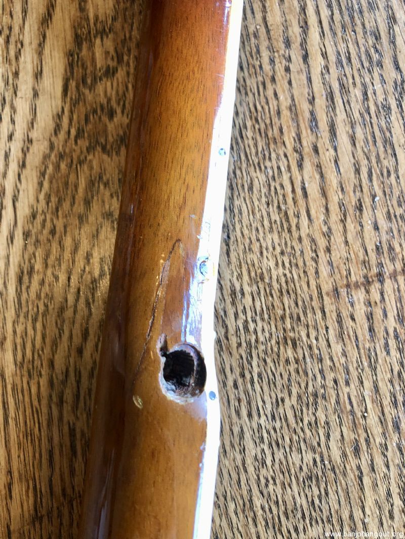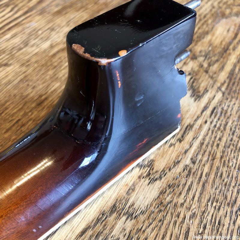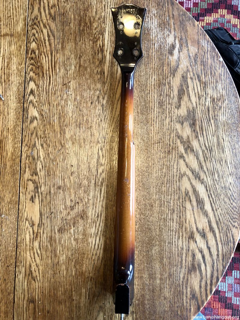 Neck from a Gibson 1968 RB-250 bowtie banjo. Nice feeling and playing neck. I purchased this years ago and it arrived with a heel crack, which I had professionally repaired with hide glue and sealed on the exterior. It's been under tension until now and has had no issues at all. Also had a not-great repair on some fifth string blowout. New frets recently installed. Feel free to reach out if you have any questions or would like to see more photos. Thanks!