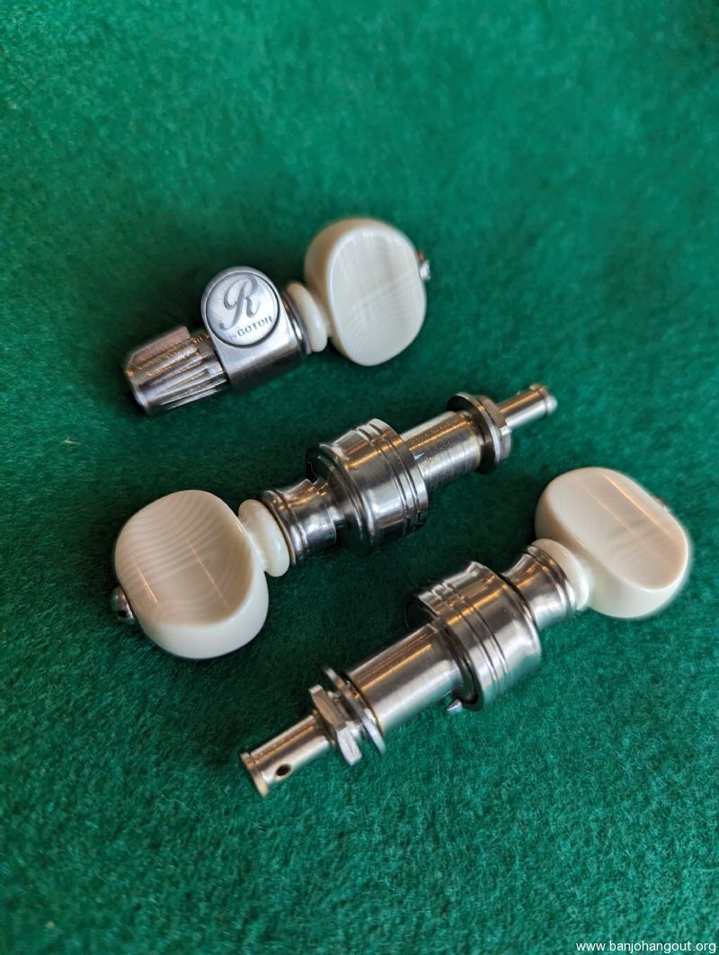 2 Rickard tuners for the peghead and a Rickard fifth tuner. Nickel, grained ivoroid buttons. Excellent condition.