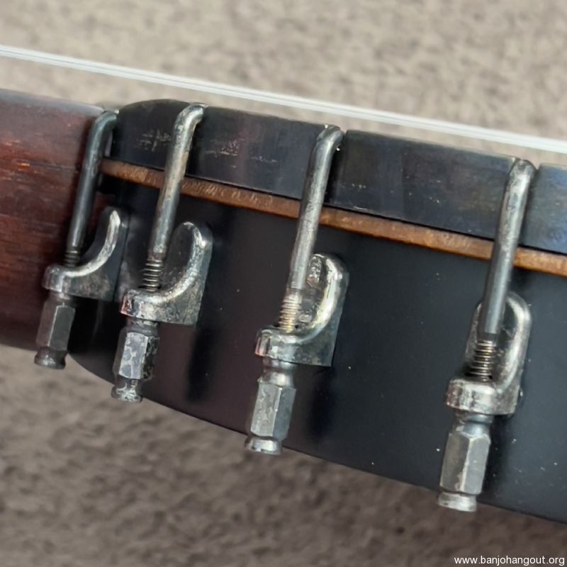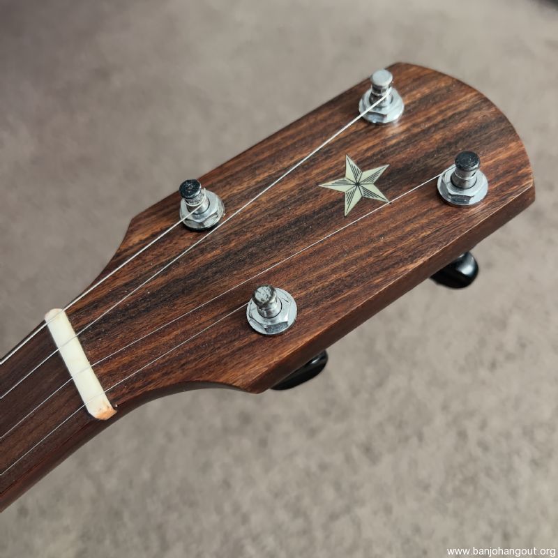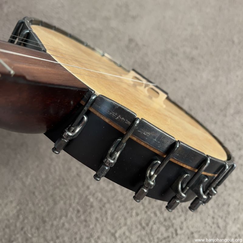 The other major improvement was the scalloping and re shaping on the tension hoop. This helps make the most of the scooped neck and makes the banjo more comfortable to play up on the neck joint. I also added an John Balch 4 star hidehead and a Snuffy Smith bridge.