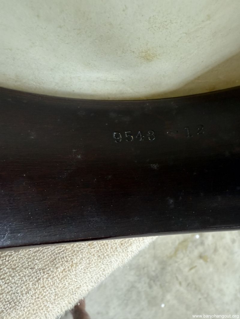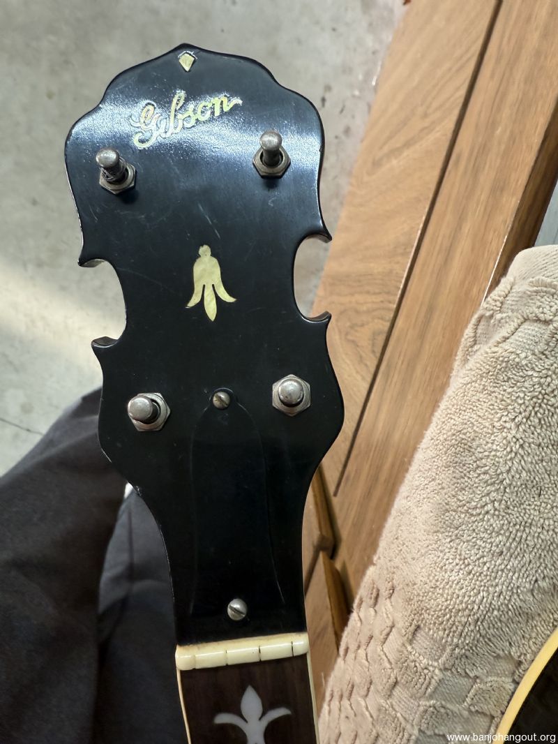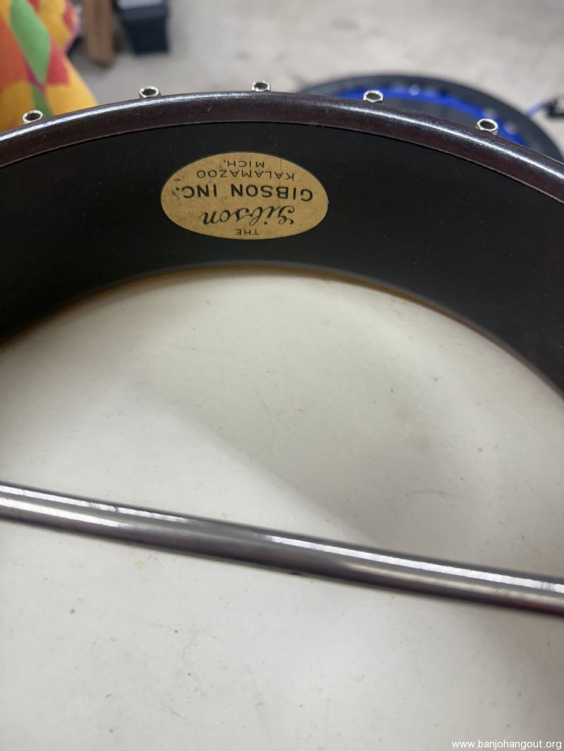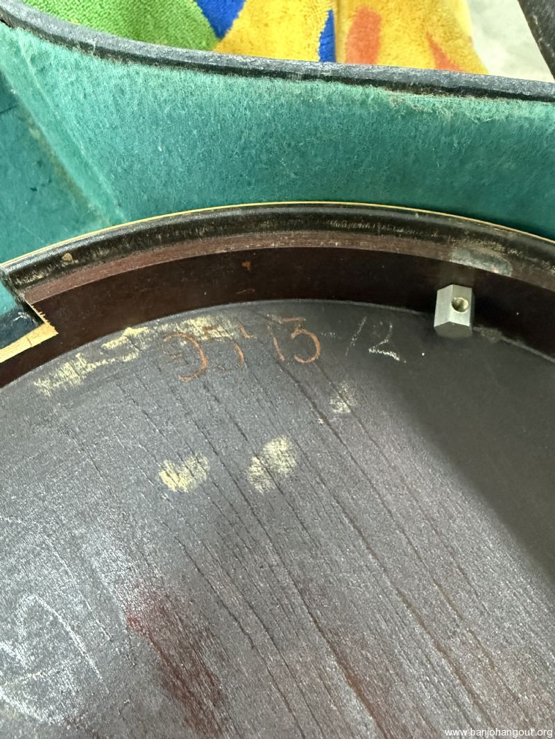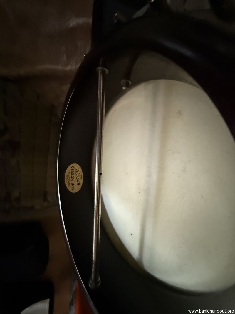 FON: 9543-12, 1930 (per Greg Earnest’s website) Gibson TB-1 in excellent condition. Fat rim (.630”). Moderate pullup of original flange as expected. The skin head is probably factory original and is in like new condition. This banjo looks like it has never been played and just sat in its case forever. All hardware original. Ratty 5-string gig type case included.