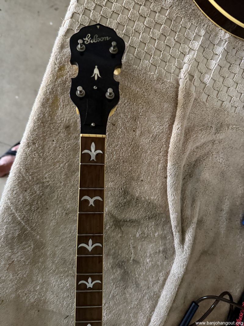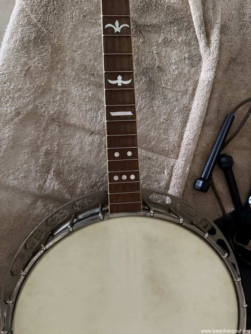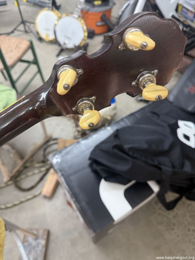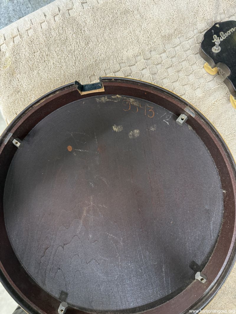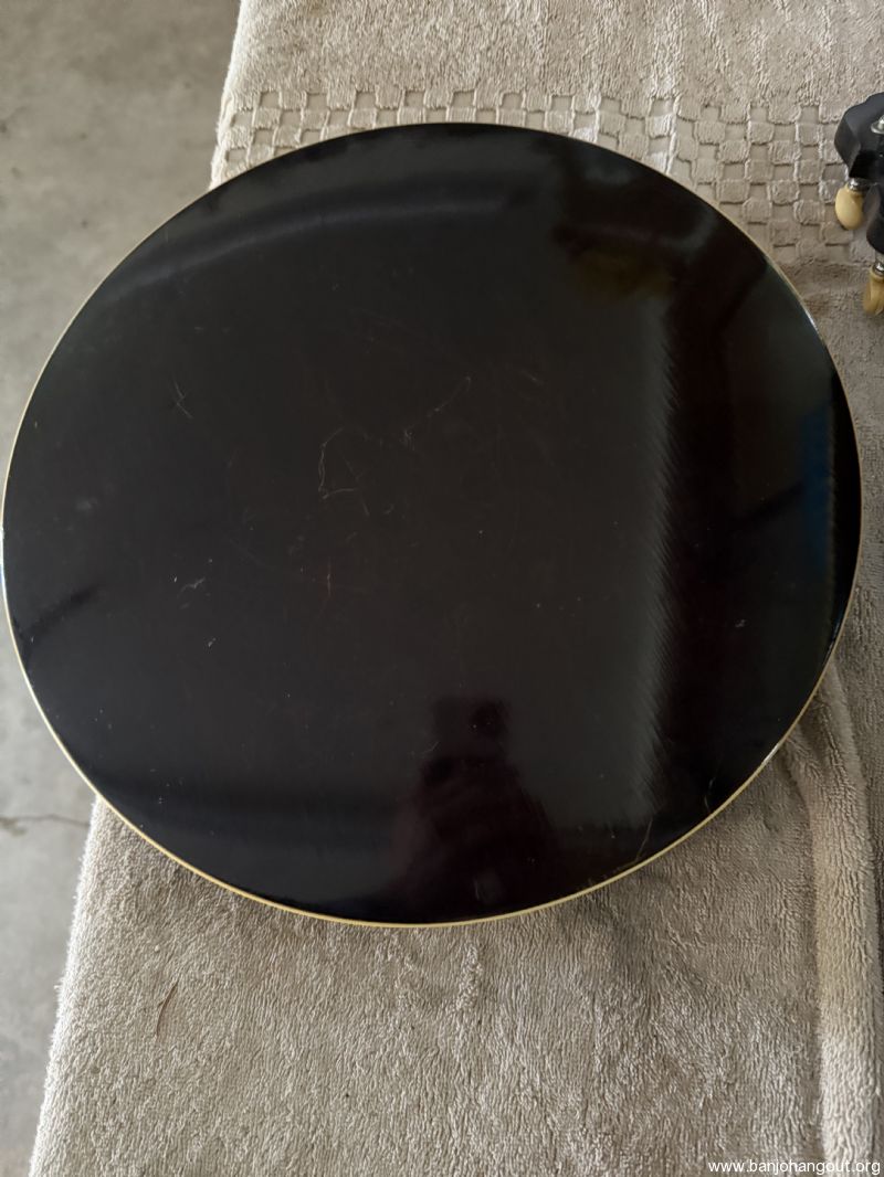 FON: 9543-12, 1930 (per Greg Earnest’s website) Gibson TB-1 in excellent condition. Fat rim (.630”). Moderate pullup of original flange as expected. The skin head is probably factory original and is in like new condition. This banjo looks like it has never been played and just sat in its case forever. All hardware original. Ratty 5-string gig type case included.