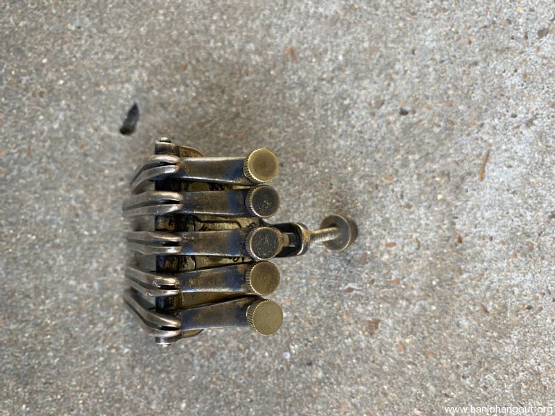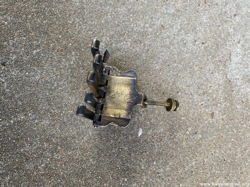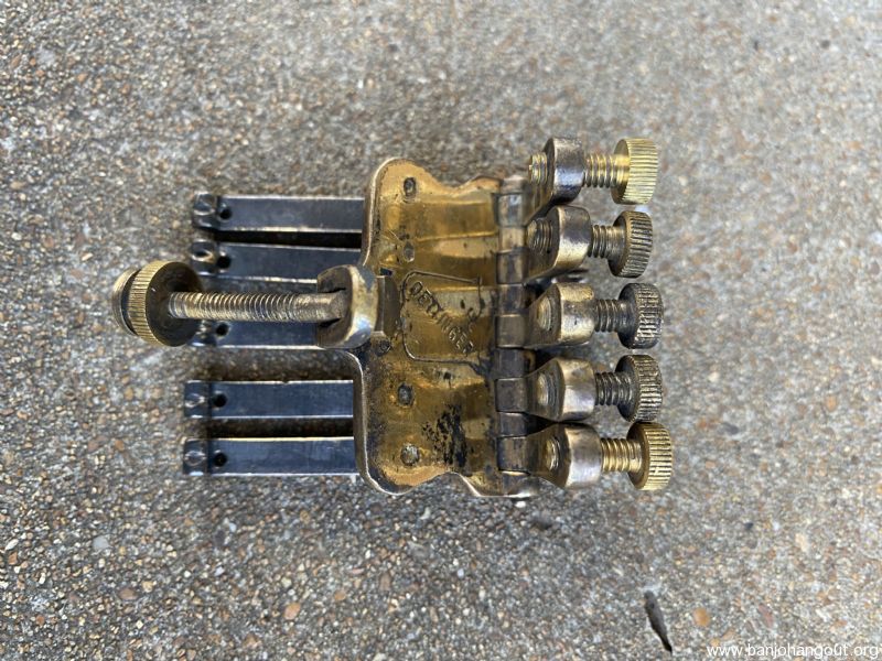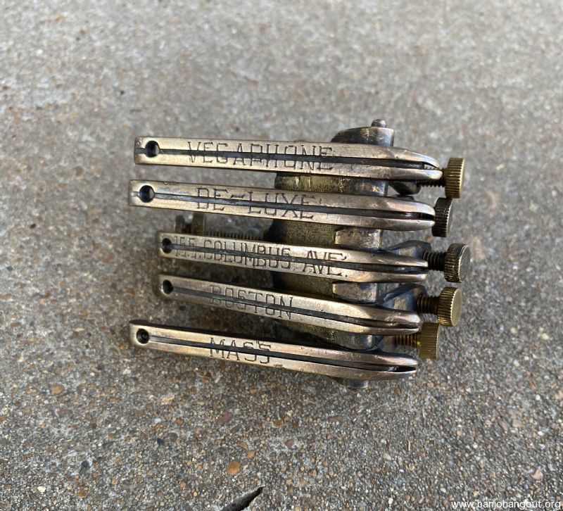 Here is a part that comes up for sale nearly never. This Oettinger tailpiece is of the very elusive variety that is five string, (somewhat) gold plated, and embossed with “Vegaphone De-Luxe 155 Columbus Ave. Boston Mass.”