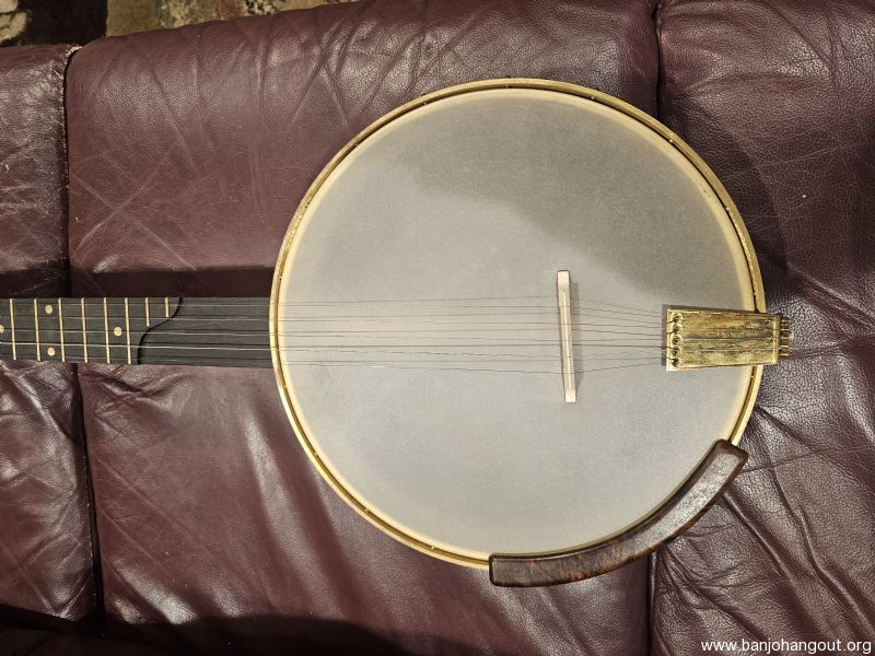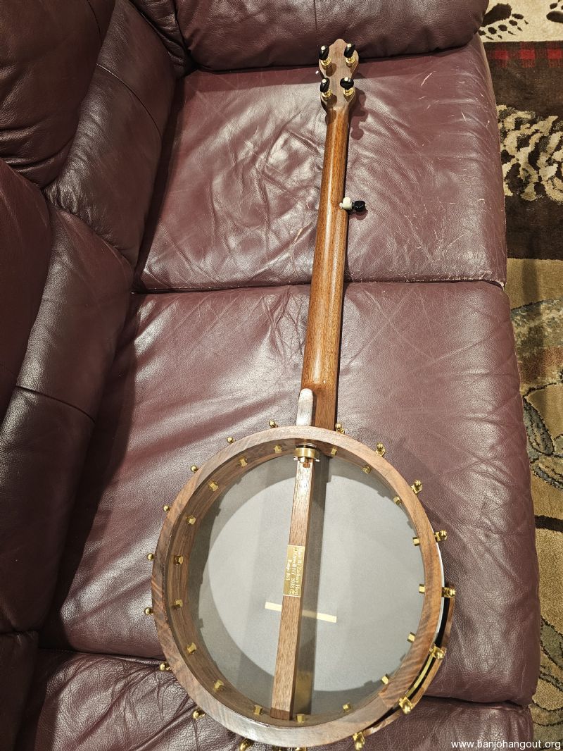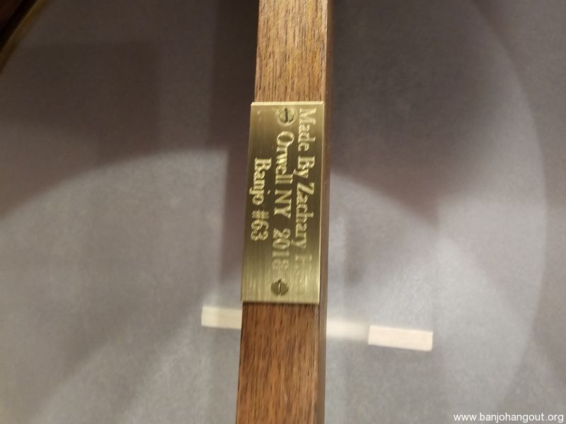This is Zach Hoyt banjo #63. I purchased it new from Mr. Hoyt and had it custom made for me. This banjo is a 29 inch long scale banjo made of walnut with an ebony fret board. It has a Whyte Laydie tone ring. This banjo is very similar to Zach's banjo 59, which can be found online. However, as noted above, this is a long scale banjo. It has a 12" pot and rim. It has railroad spikes on the 6, 7, and 8 frets. It is also scooped for clawhammer. It has brass components.