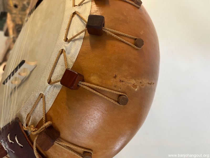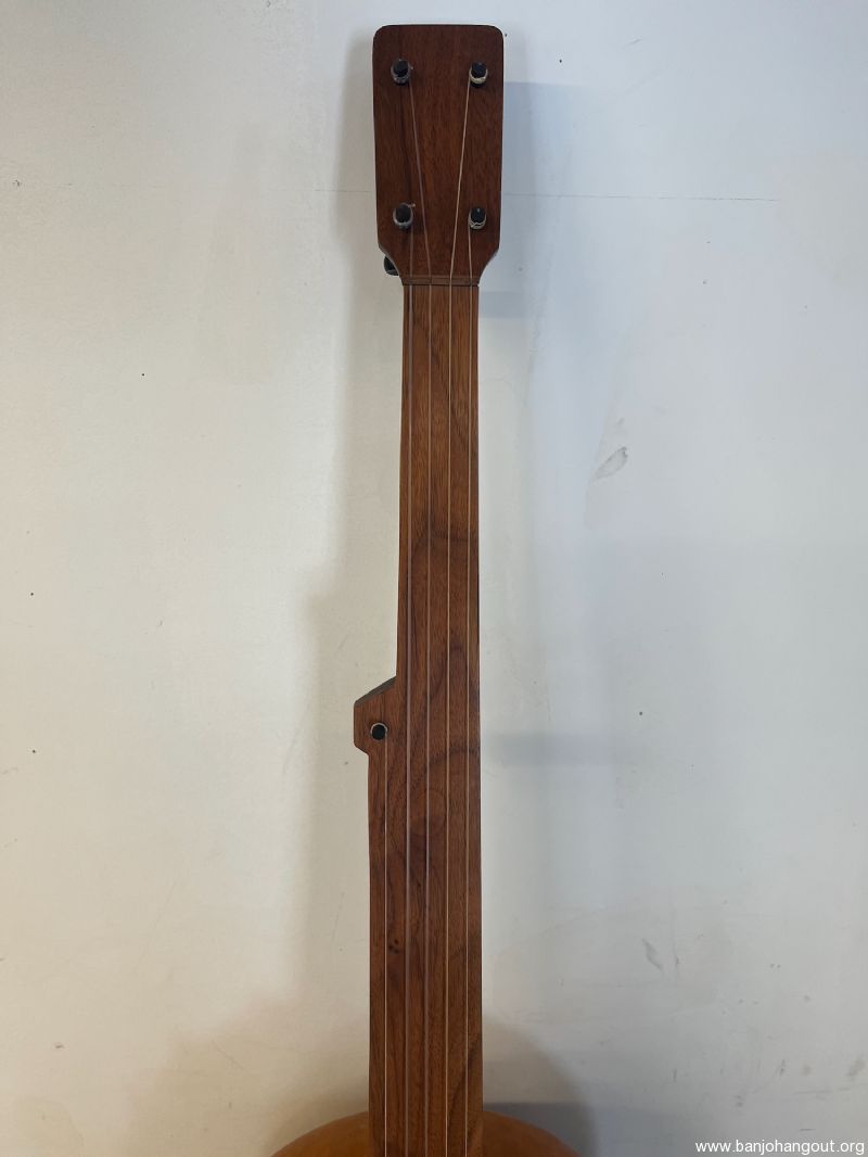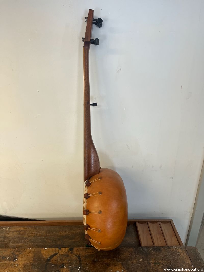 This large gourd banjo was made by Bob Thornburg. Sometime in 2010's is a total guess and I would assume possibly earlier but I'm unsure how to date Bob's work. I've owned it for around 10 years now but I'm not the original owner. It's a great banjo with a big boomy sound just like you'd expect from its massive 13-14" gourd and long 27-28" scale length. It's in pretty much perfect condition other than a little scuff on the top of the peghead on the bass side corner and maybe a little on the opposite. It's a really fun banjo to play and it has a very unique voice even for a gourd banjo.