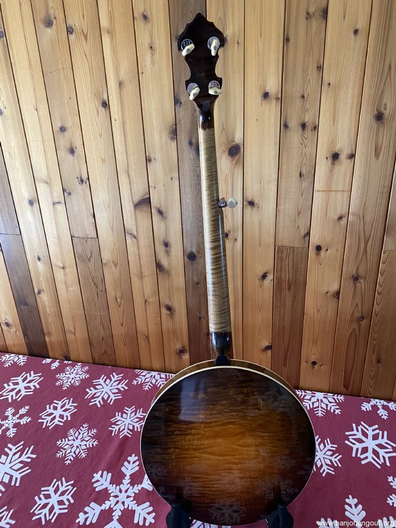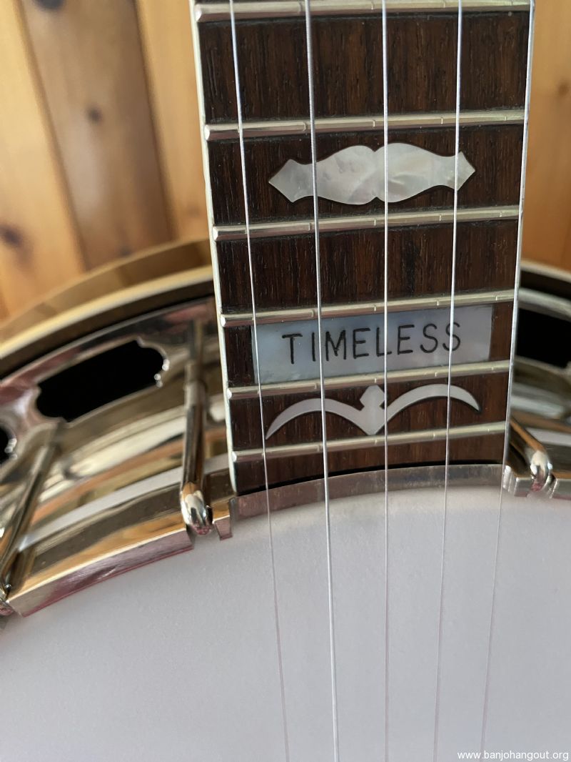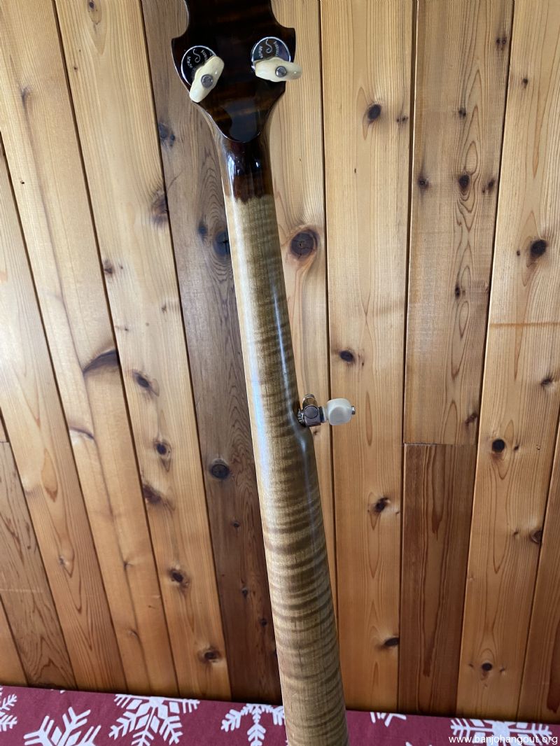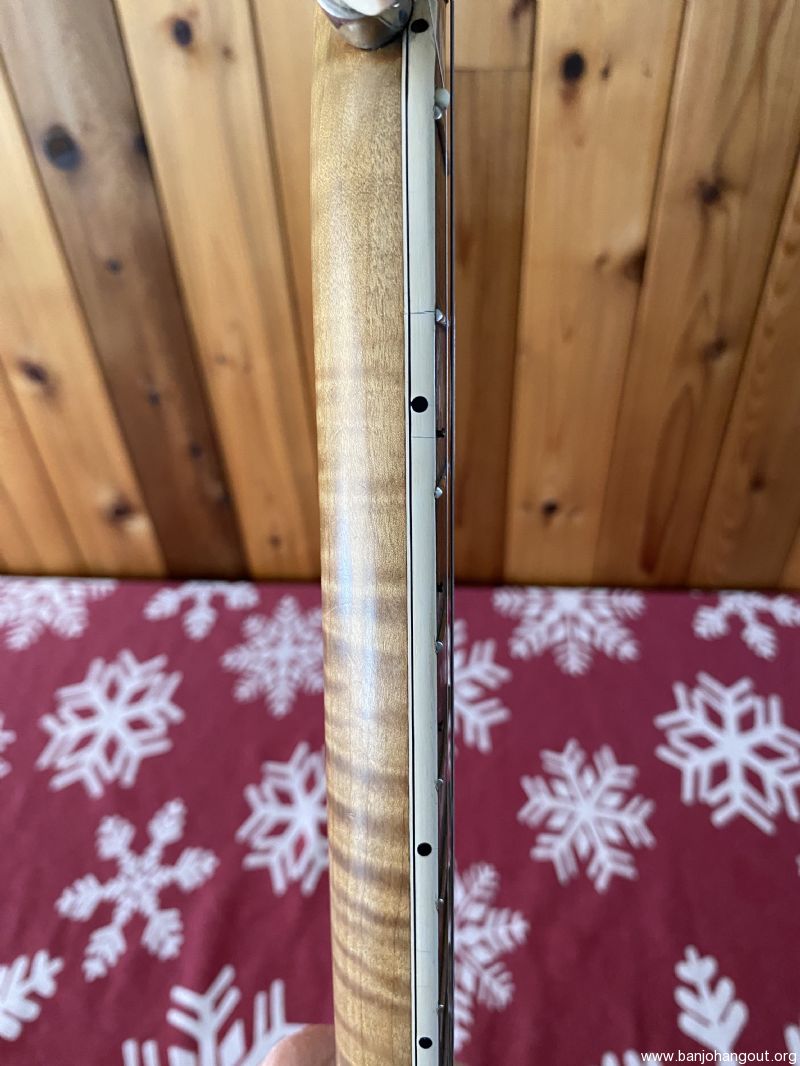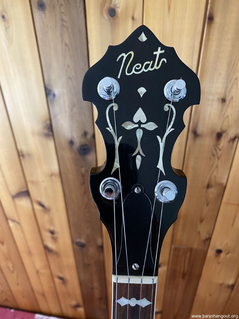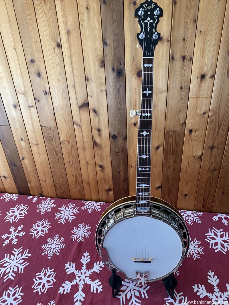 Neat “Timeless” maple banjo with a Yates Venom V33 tone ring. Great playing banjo as expected with a Frank Neat neck. They are the best. Excellent tone, volume and responsiveness. The frets were freshly leveled and dressed in 2024. There are some scratches and light indentations on both the neck and resonator that are difficult to see in the pictures. Also the neck binding has some hairline cracks at the fret ends. Nothing serious at all and the binding remains well adhered to the neck. Comes in a Superior white fiberglass case.