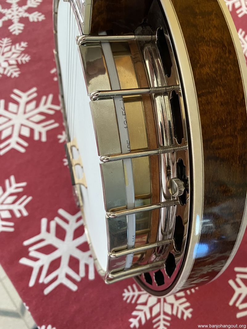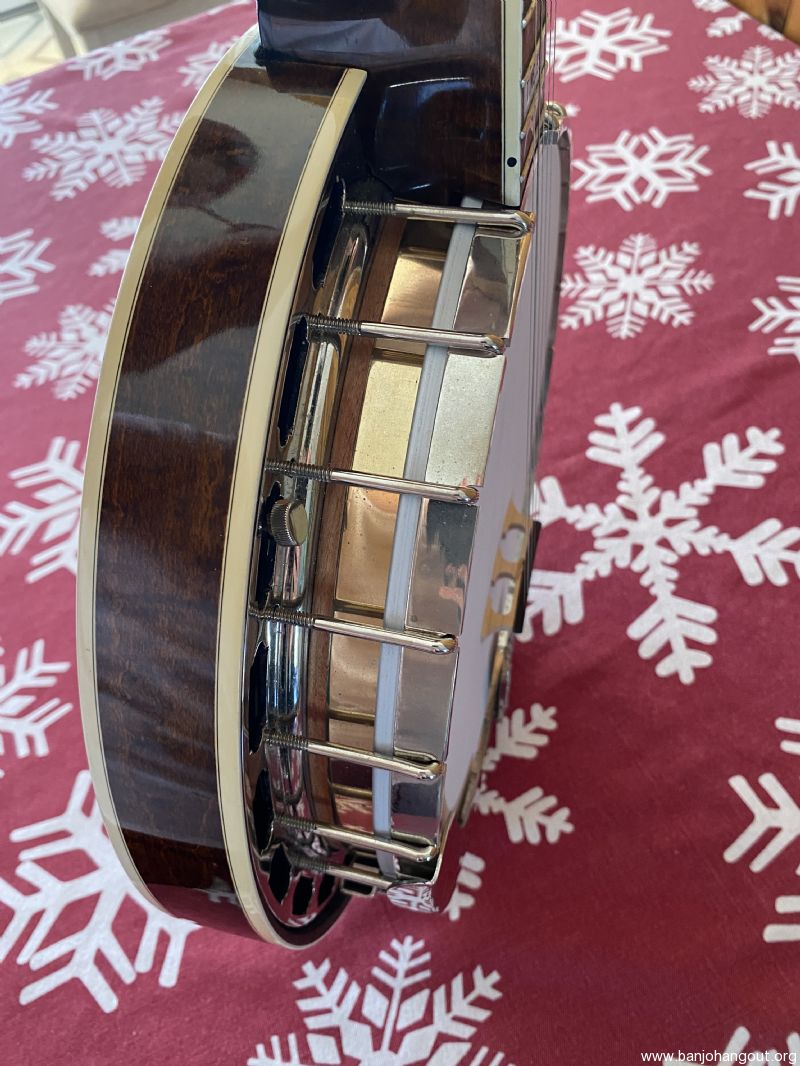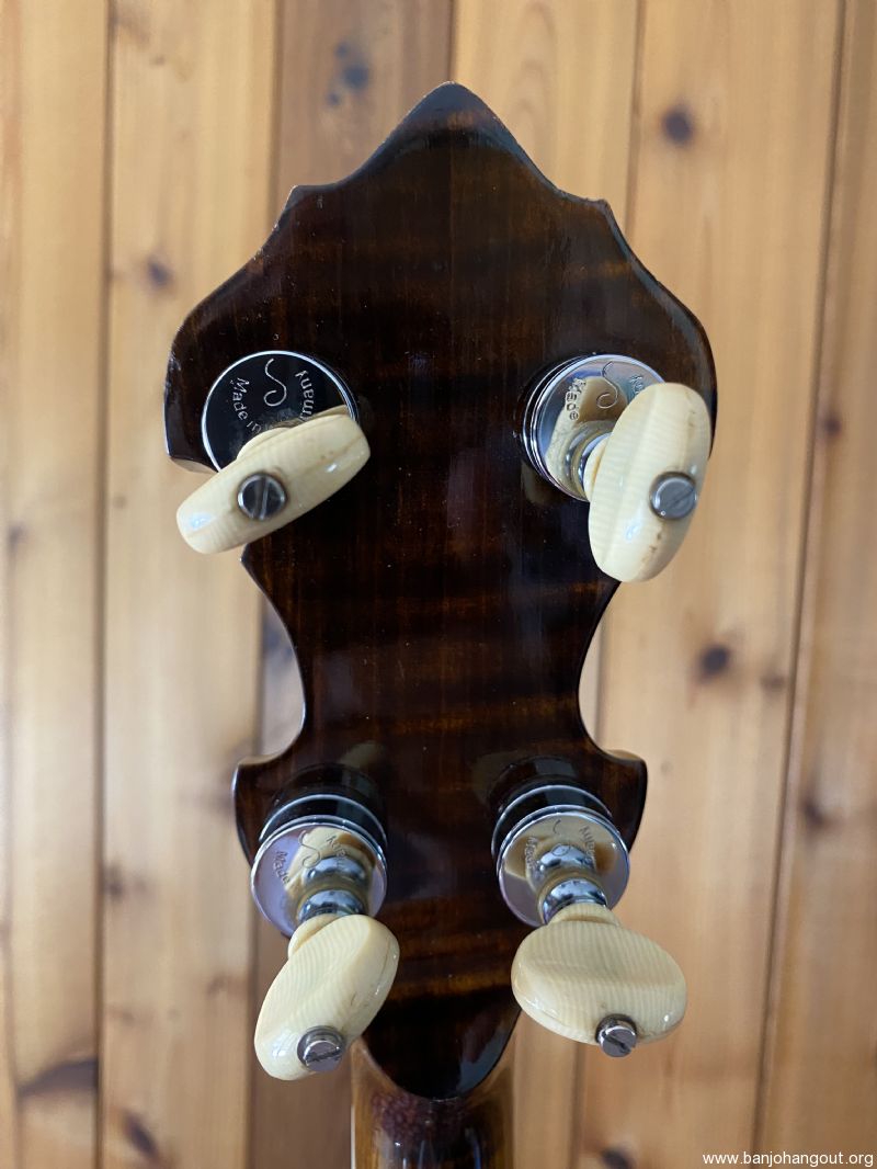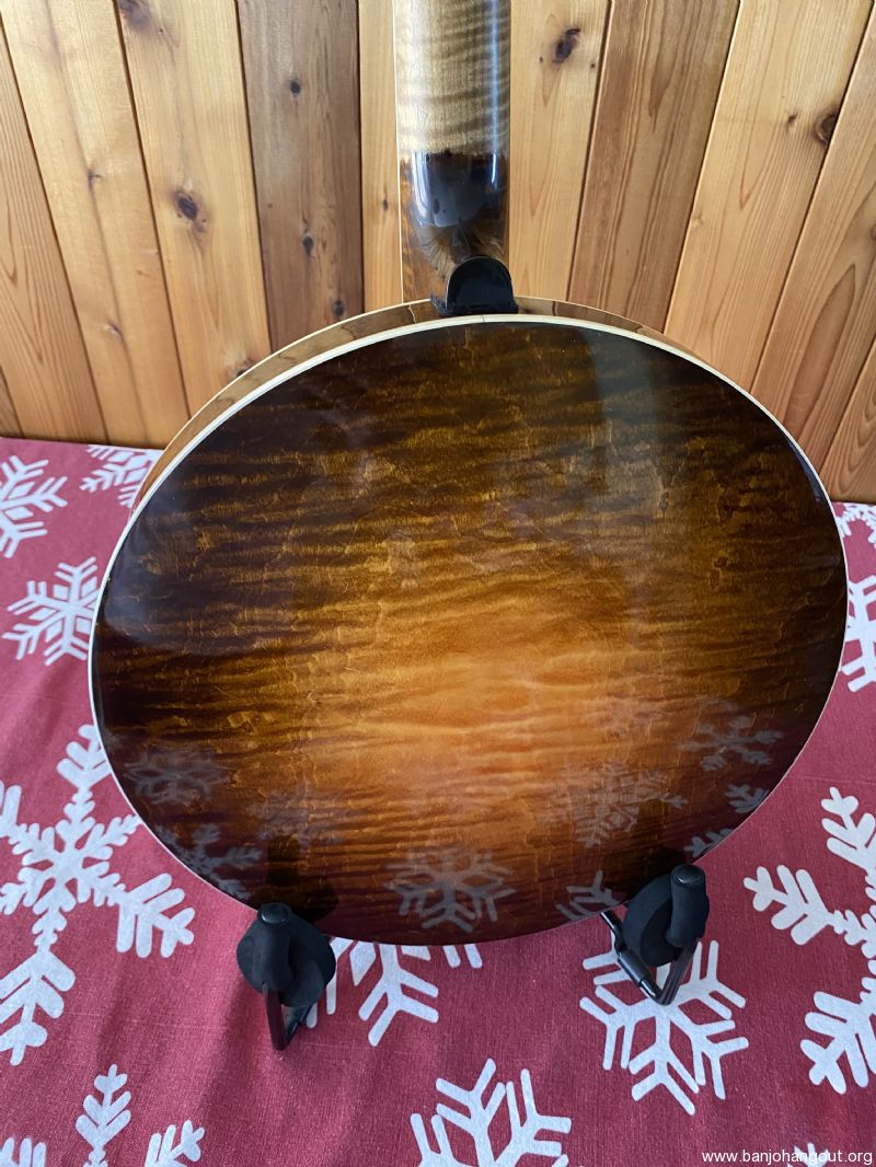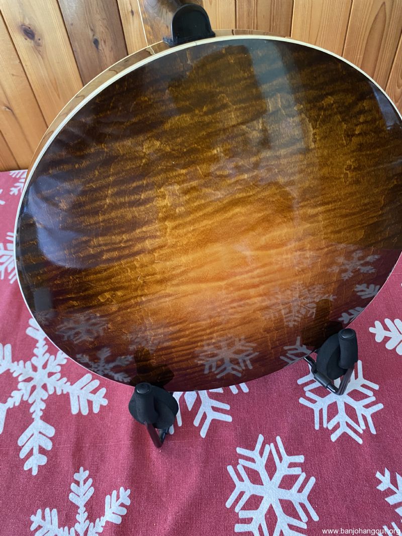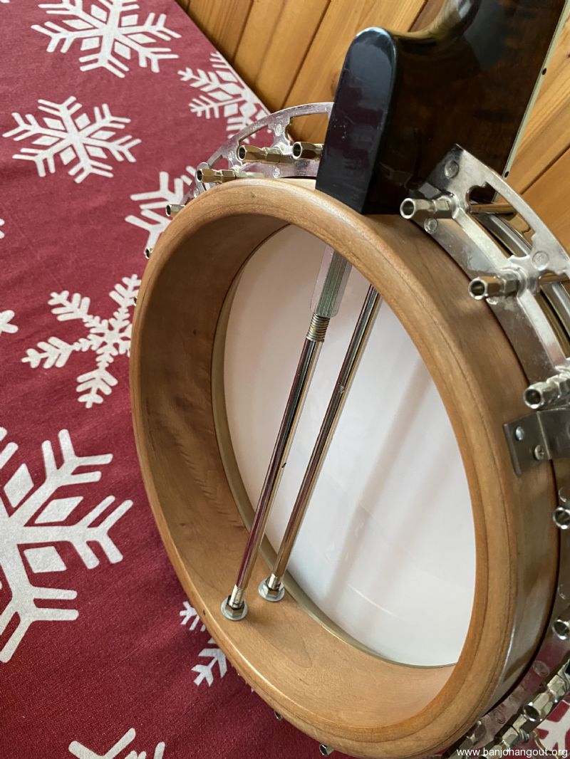 Neat “Timeless” maple banjo with a Yates Venom V33 tone ring. Great playing banjo as expected with a Frank Neat neck. They are the best. Excellent tone, volume and responsiveness. The frets were freshly leveled and dressed in 2024. There are some scratches and light indentations on both the neck and resonator that are difficult to see in the pictures. Also the neck binding has some hairline cracks at the fret ends. Nothing serious at all and the binding remains well adhered to the neck. Comes in a Superior white fiberglass case.