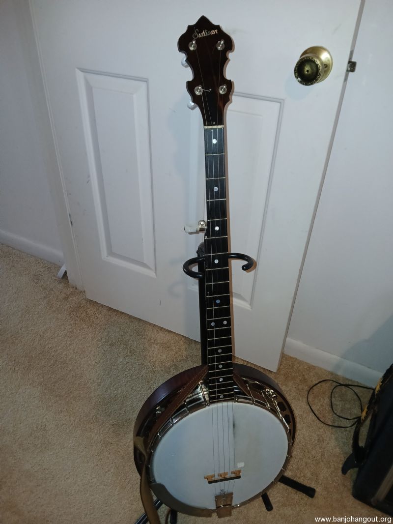 Sullivan Jam features figured maple neck, ebony fingerboard, spikes at 7&9. Presto tail piece, Sullivan bridge, stickers cover pearl dots. Nickel hardware, Brass rolled tone hoop, one piece flange. Loud and clear weighing only 9.6 lbs. Sticker on back covers a small ding I was told. Fresh set of EJ61's. Clean TKL hardshell case.