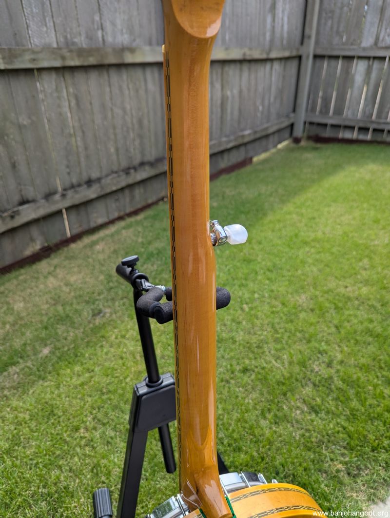 This banjo is probably at least from the 1980's, judging by the age of the previous owner. The wood finish is almost blemish free. There is a hazy area right above the second string tuner that is easy to miss in some lighting. It isn't the result of any kind of impact. The metal hardware appears to be chrome plated. The exception to chrome plating is the tube, which appears to be nickel. Possibly the tube had to be replaced at some point. Take a look at the photos. The banjo is striking in appearance. The workmanship is exceptional.