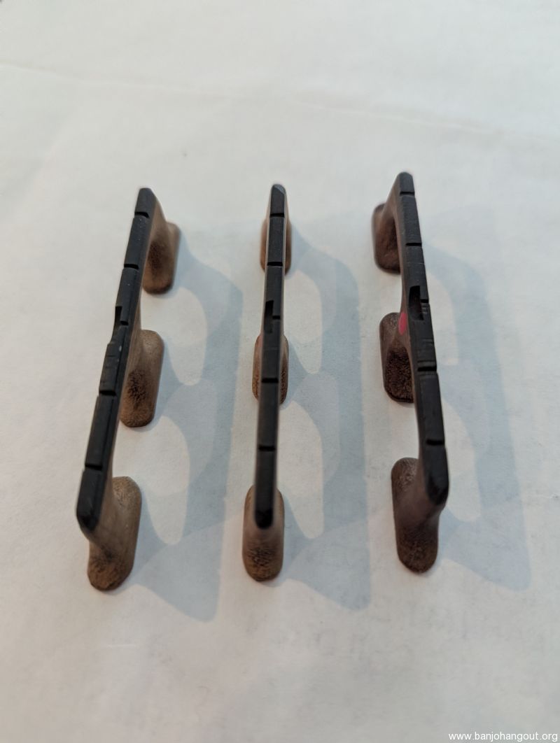 Three rare Hot Spot bridges. Two are 11/16" with a string spacing wider than Crowe spacing. One is 5/8" with standard spacing. Sold as a group of three.