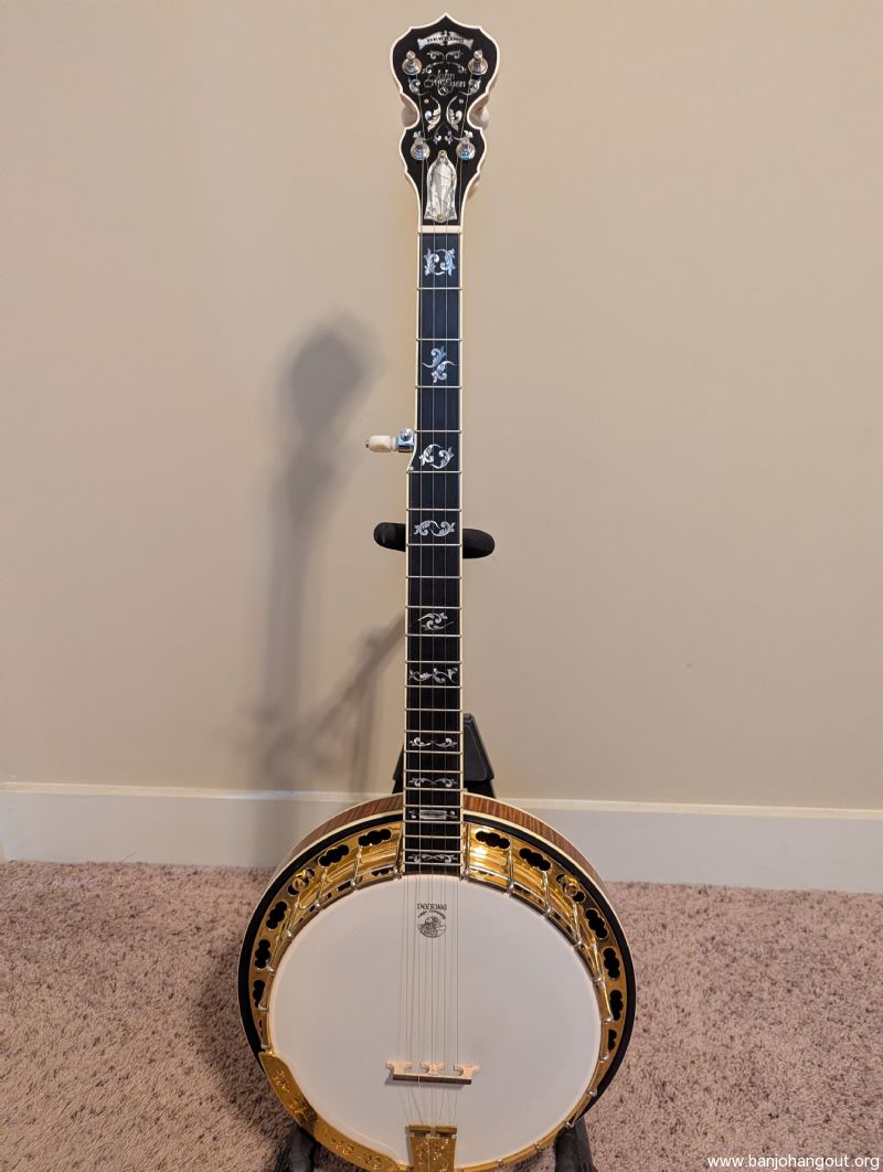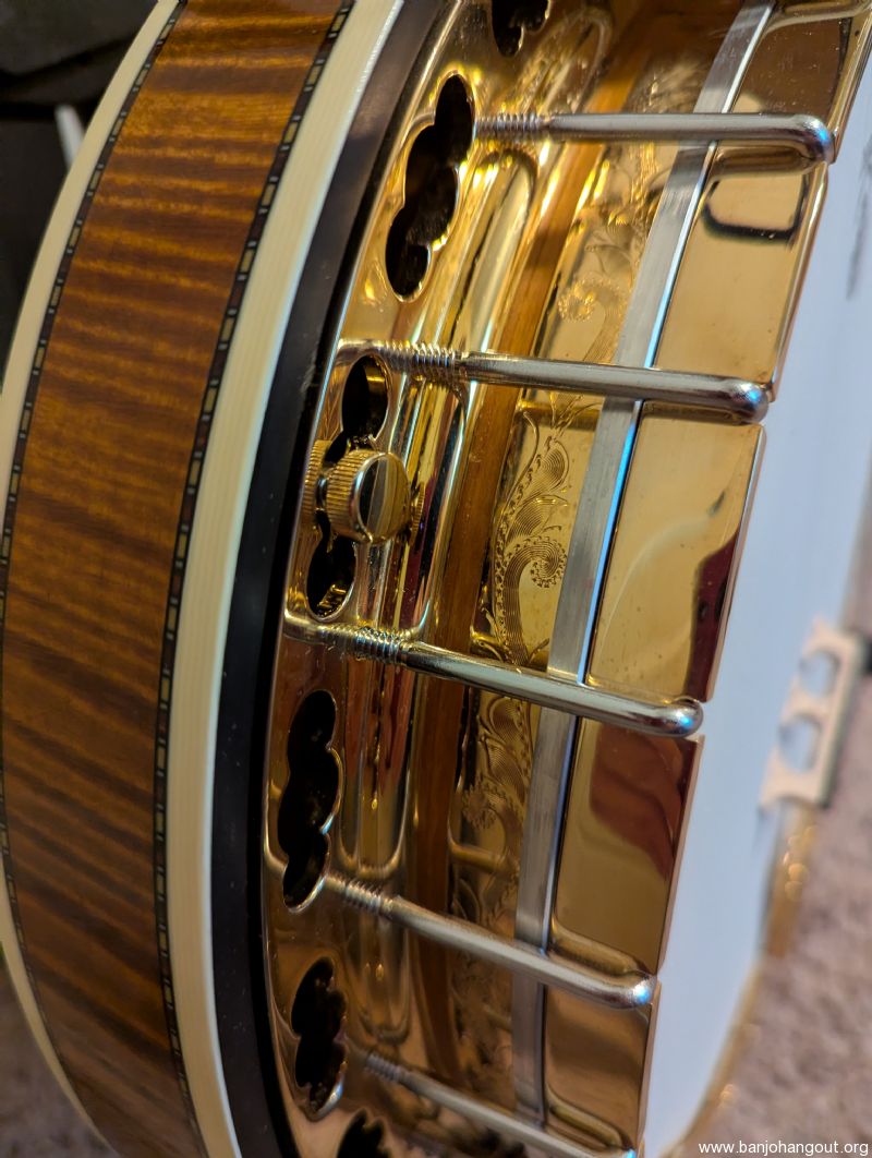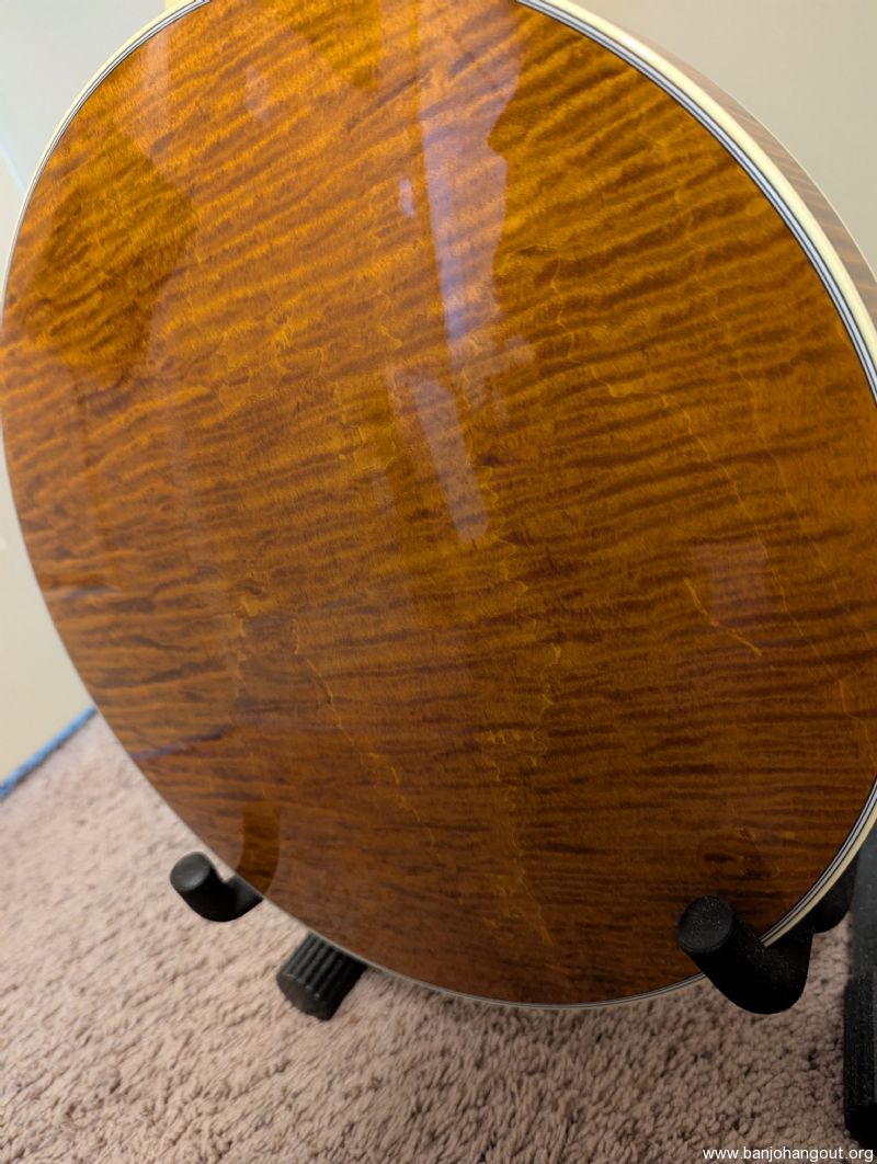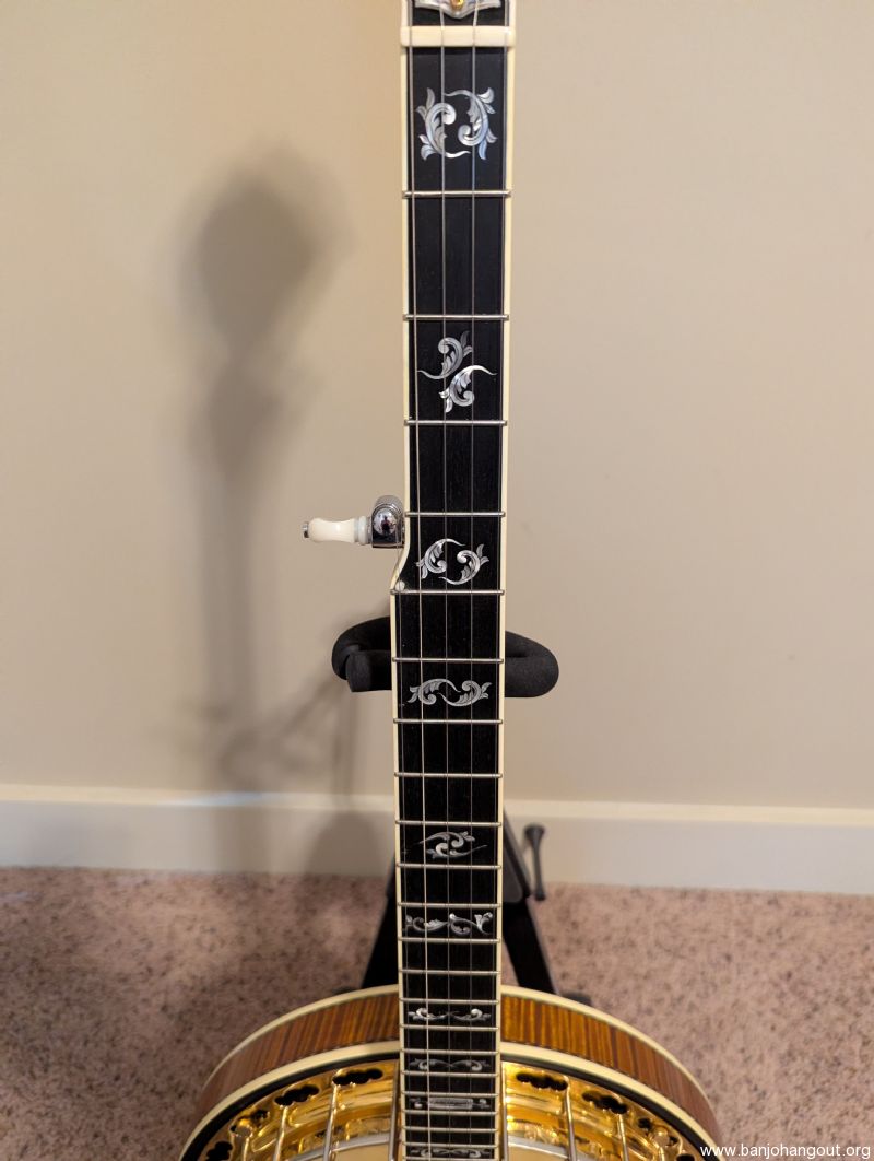 The photos illustrate the stunning appearance of this banjo. The sound and playability of this banjo is off the charts. You will notice that John specified stainless Keith tuners and nickel plated tuners. This banjo is as these 9 banjos were produced in accordance with John's wishes. The engraving on the metal and the original inlay design is tasteful and very attractive. The beautiful highly figured maple is stained and has inlayed wood marquetry in some areas.