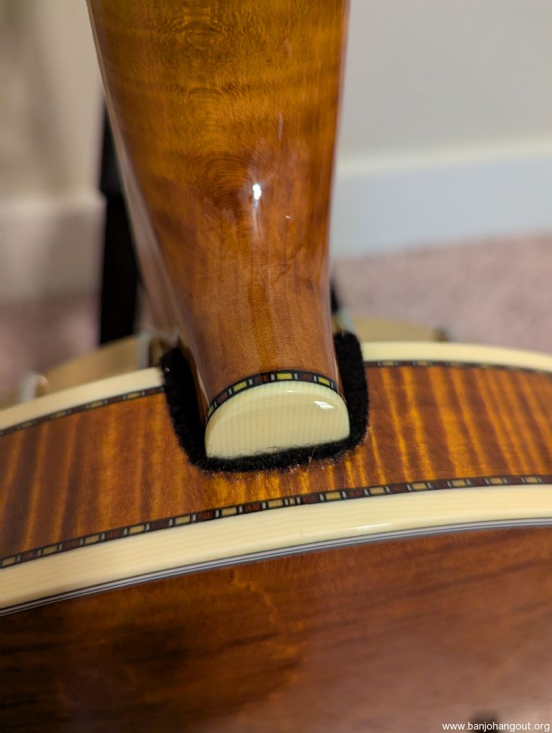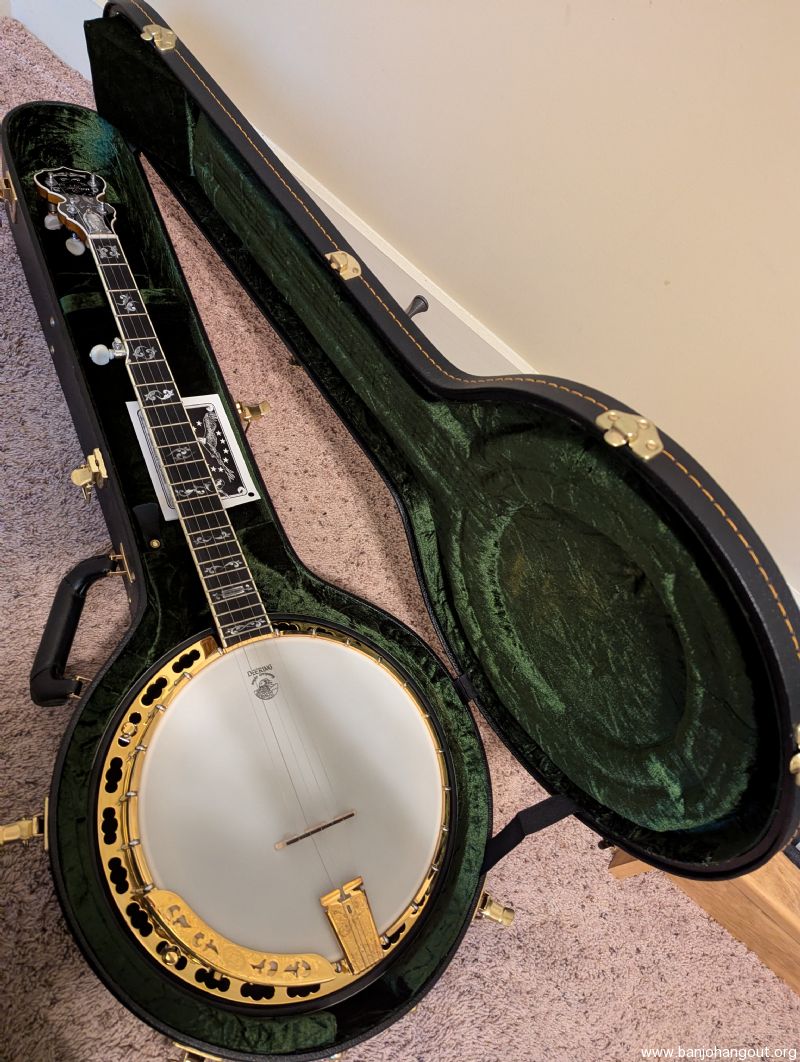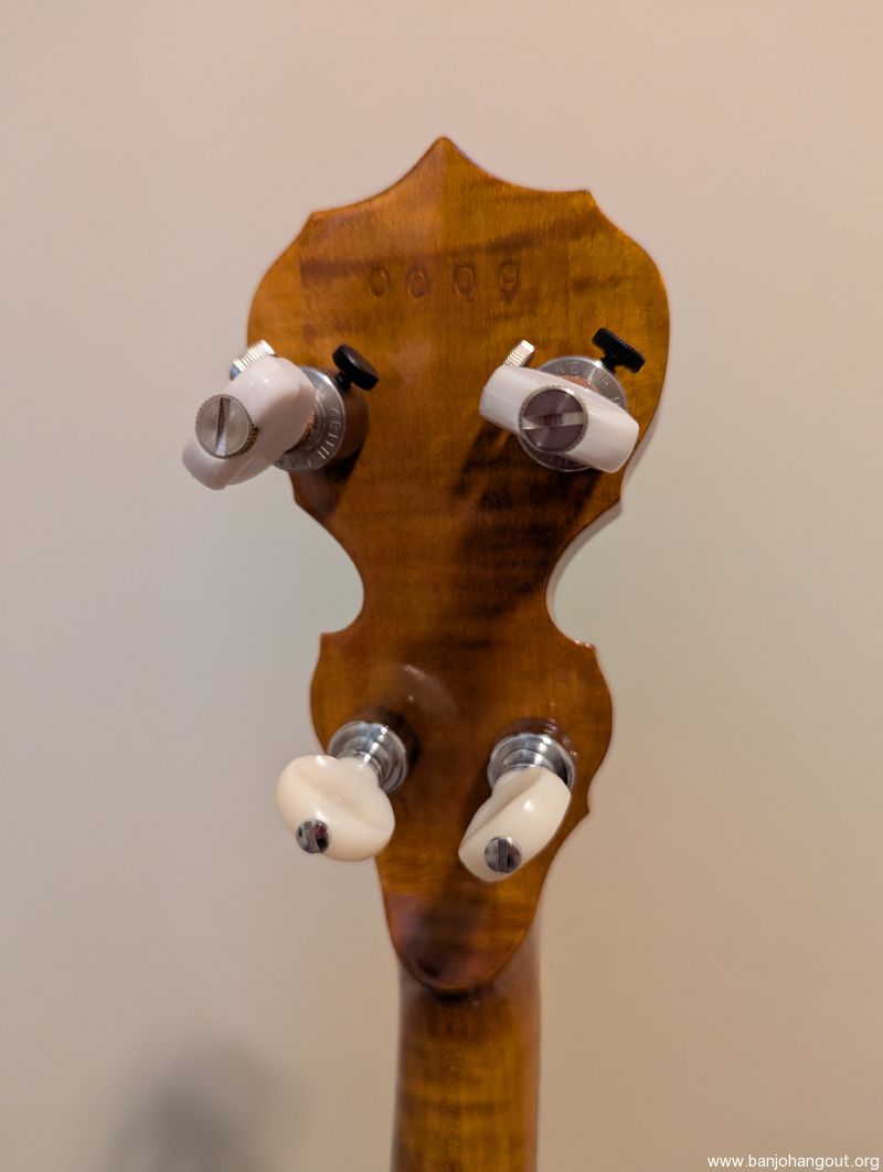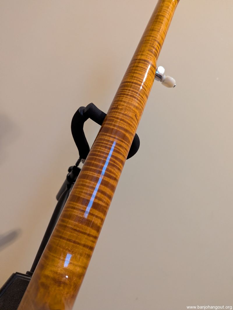 The photos illustrate the stunning appearance of this banjo. The sound and playability of this banjo is off the charts. You will notice that John specified stainless Keith tuners and nickel plated tuners. This banjo is as these 9 banjos were produced in accordance with John's wishes. The engraving on the metal and the original inlay design is tasteful and very attractive. The beautiful highly figured maple is stained and has inlayed wood marquetry in some areas.