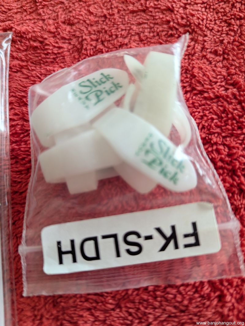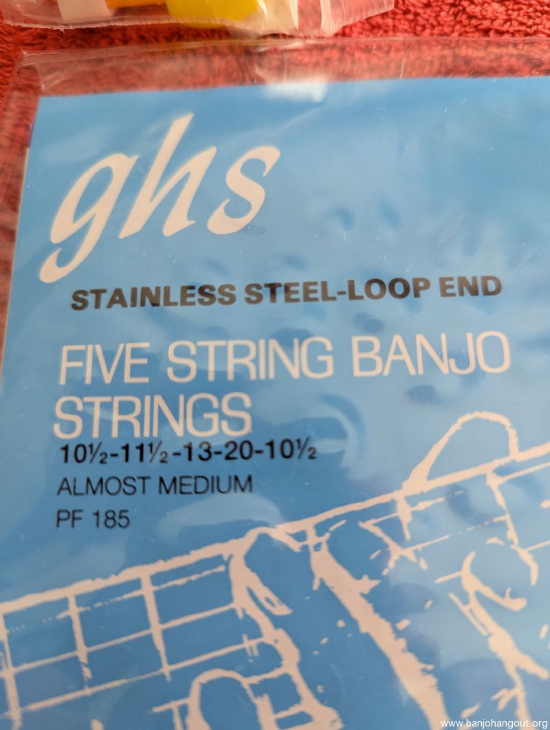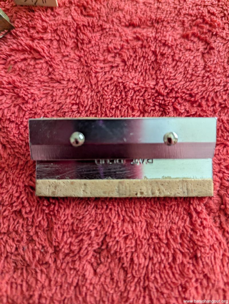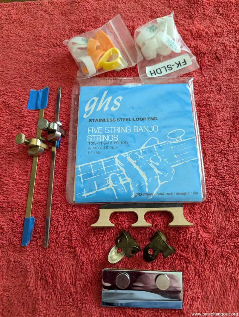 Bridge is 11/16" Crowe spaced, finger picks are brass Dunlops light gauged (have been used), a very nice banjo mute that appears to be new. Thumb picks in original packages. GHS almost medium banjo strings and two Shubb sliding capos, with screws, one gold and one nickel.