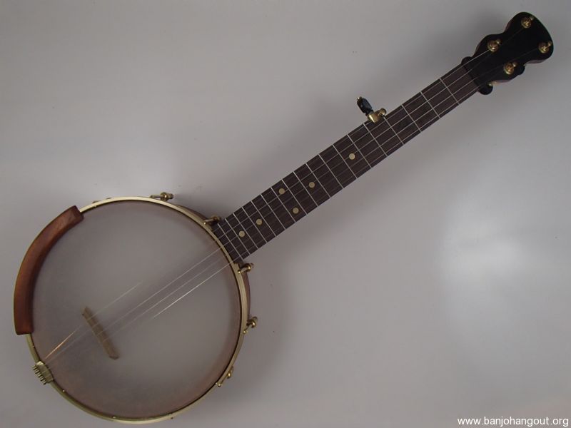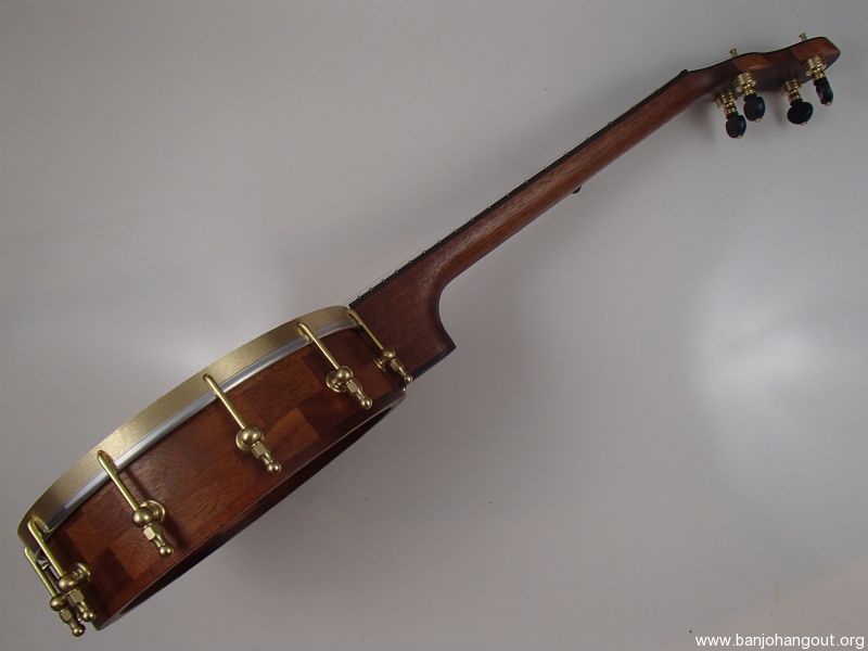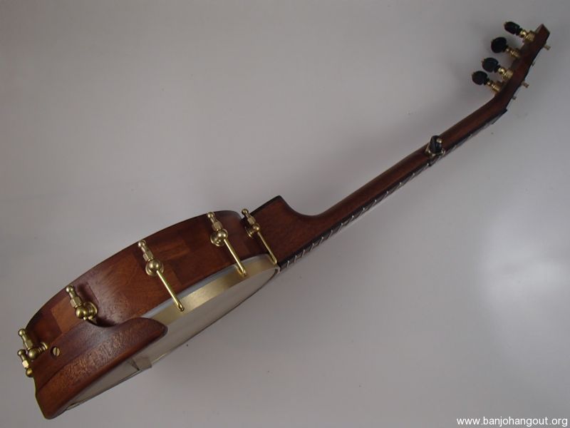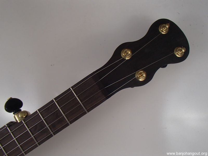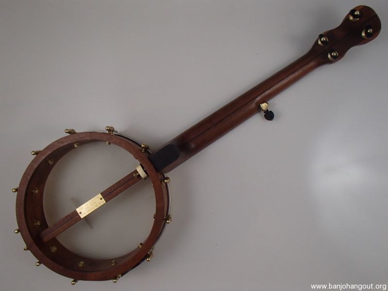 This banjo has an African mahogany rim, neck and Romero-style armrest, with a rosewood peghead overlay, fretboard, and neck stripe.. I will sell the banjo without the armrest for $35 less if it isn’t wanted. This banjo has a Renaissance head on a 10" block rim with a wood tone ring profile. The scale length is 19-3/4" and the nut is 1-3/8" wide. The neck has a two way truss rod accessed from the heel, brass dots, Gotoh tuners and Corian nut and pip. I made the Van Eps style tension hoop and the dowel stick yoke, the tuners and head came from Smakula Fretted Instruments and the rest of the hardware came from Ode Banjos. The finish is Tru Oil. There is a brass plate on the dowel stick with the banjo number and such on it. The banjo is currently set up with a tall 5th string nut to raise the 5th to the level of the other strings, but I can shorten the nut so the string rests on the 5th fret if desired. I can also add 5th string spikes for $5 each. I will exchange the Renaissance head for a Fiberskyn if desired at no charge.