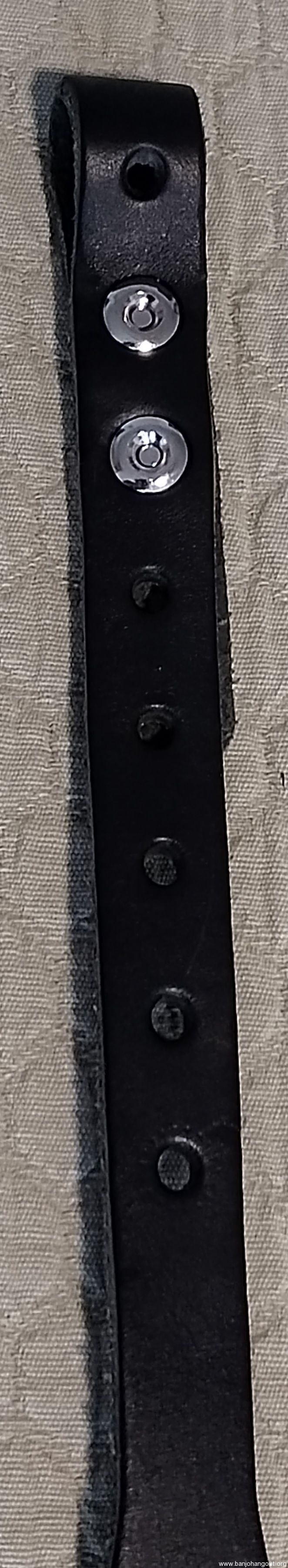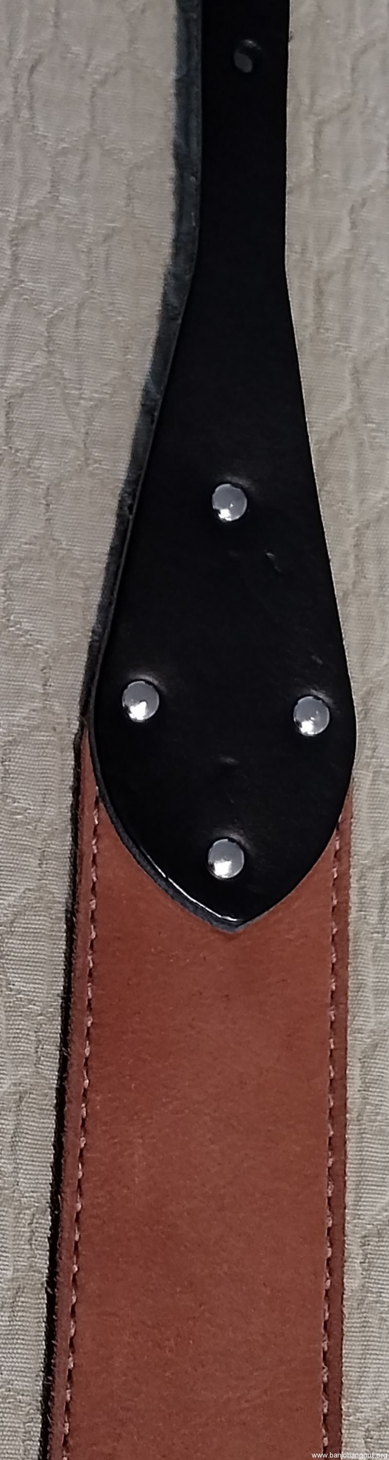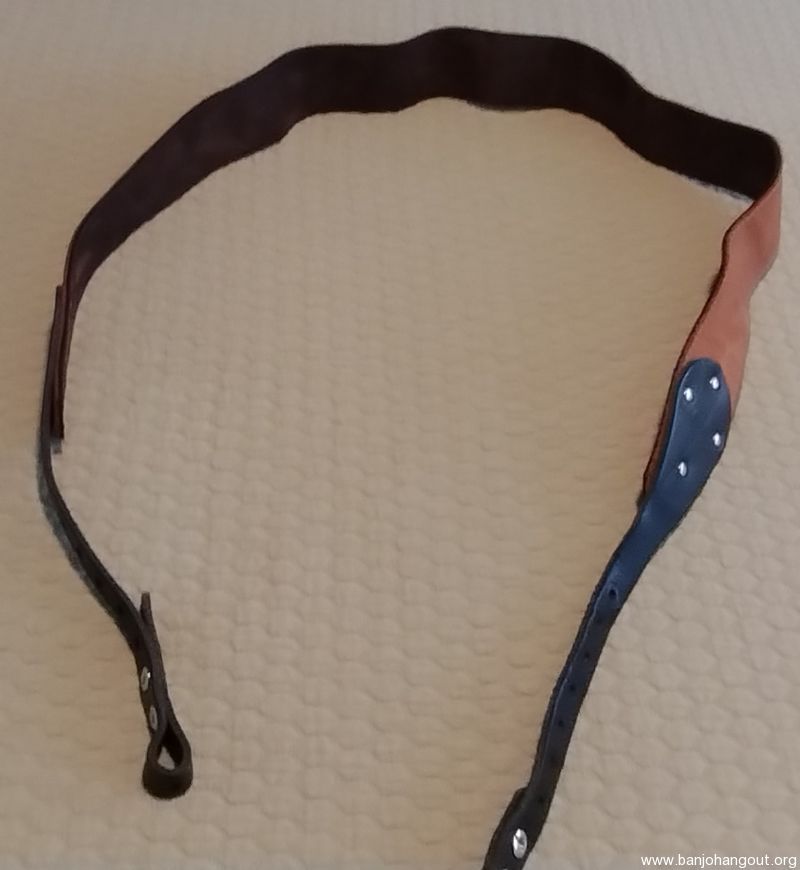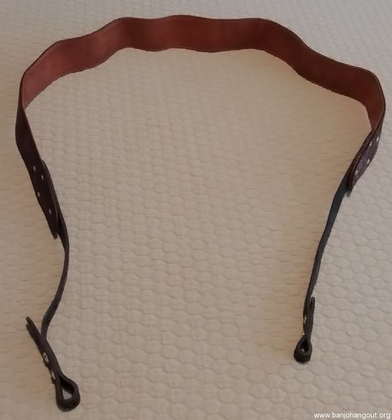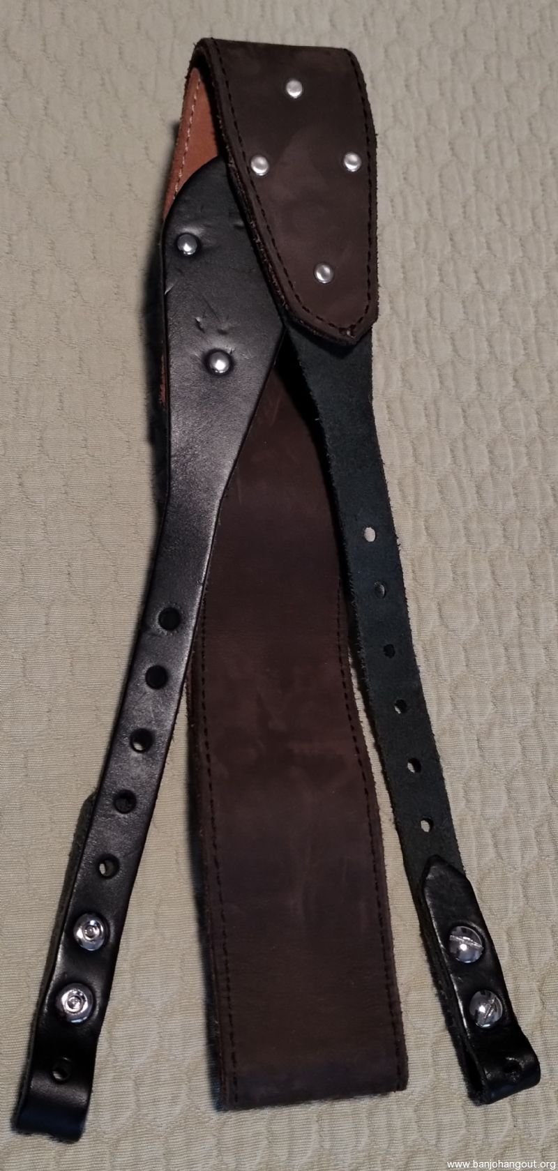 "Rusty Nuckles" (brand) banjo Strap. Two-tone, thick leather with Chicago screws (4-total). 2" in width & 57" in length (note: length measurement is after attaching screws). Purchased new & used about 4 times. Reason for selling? I've found I really prefer a very narrow strap.