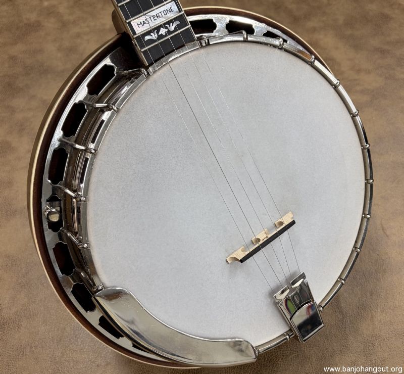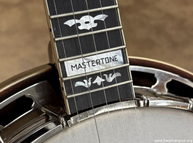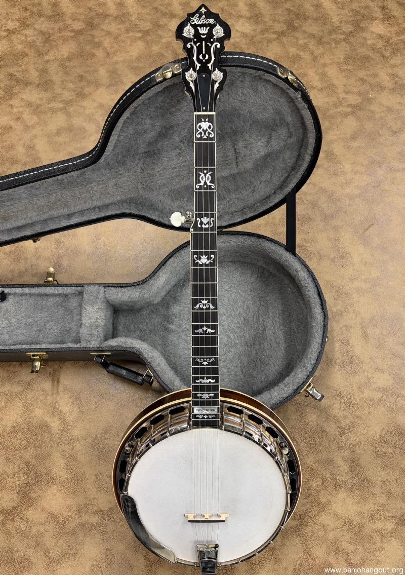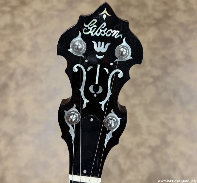 This "Gibson" branded banjo features a mahogany neck with a radius fretboard. The inlay is the "Blackjack/Style 3" pattern from years ago. I do not know the maker but it has a fantastic profile with great playability. The rest of the banjo is the standard Mastertone style pot assembly with the 38 Special 20-hole tone ring and nickel plated hardware. The finish is satin/gloss and it ships in a hard case. Thanks for looking! Here's video: youtube.com/watch?v=RGikAiicTjE