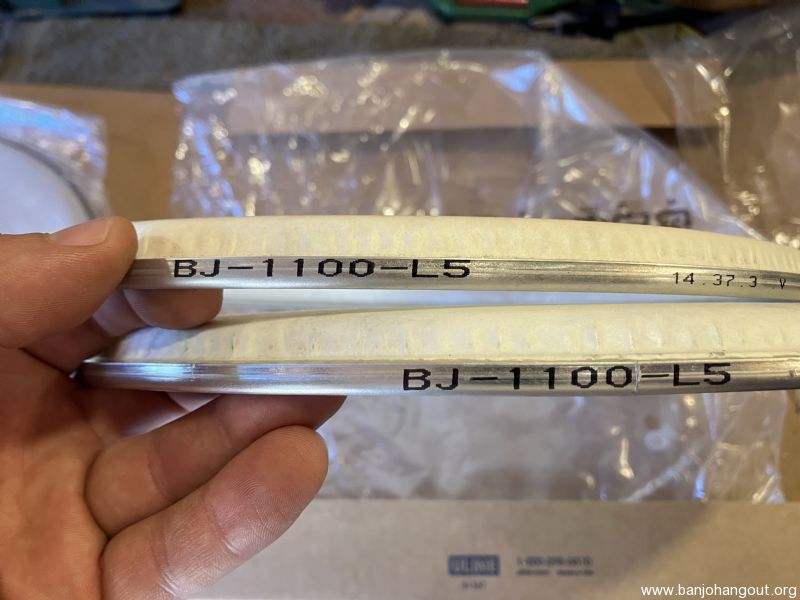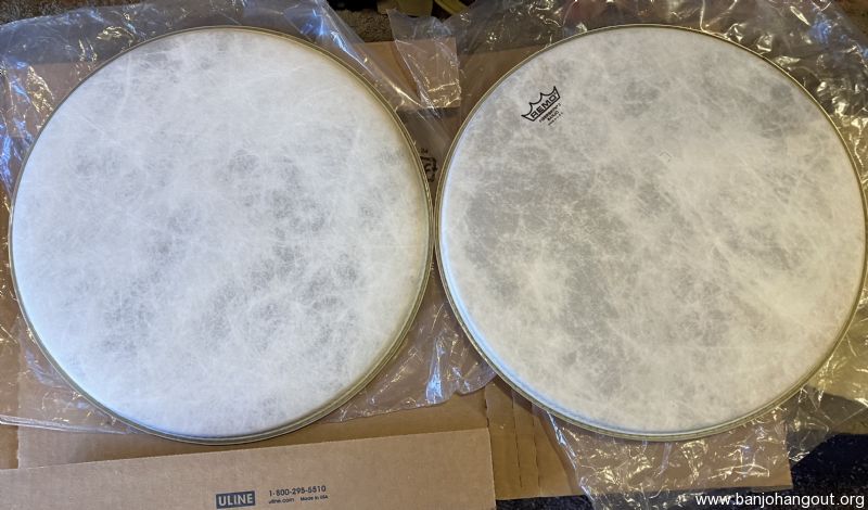 Lightly used heads. One with Remo logo (has pencil marks for bridge) and one without. Both have been mounted one time, removed, and stored.