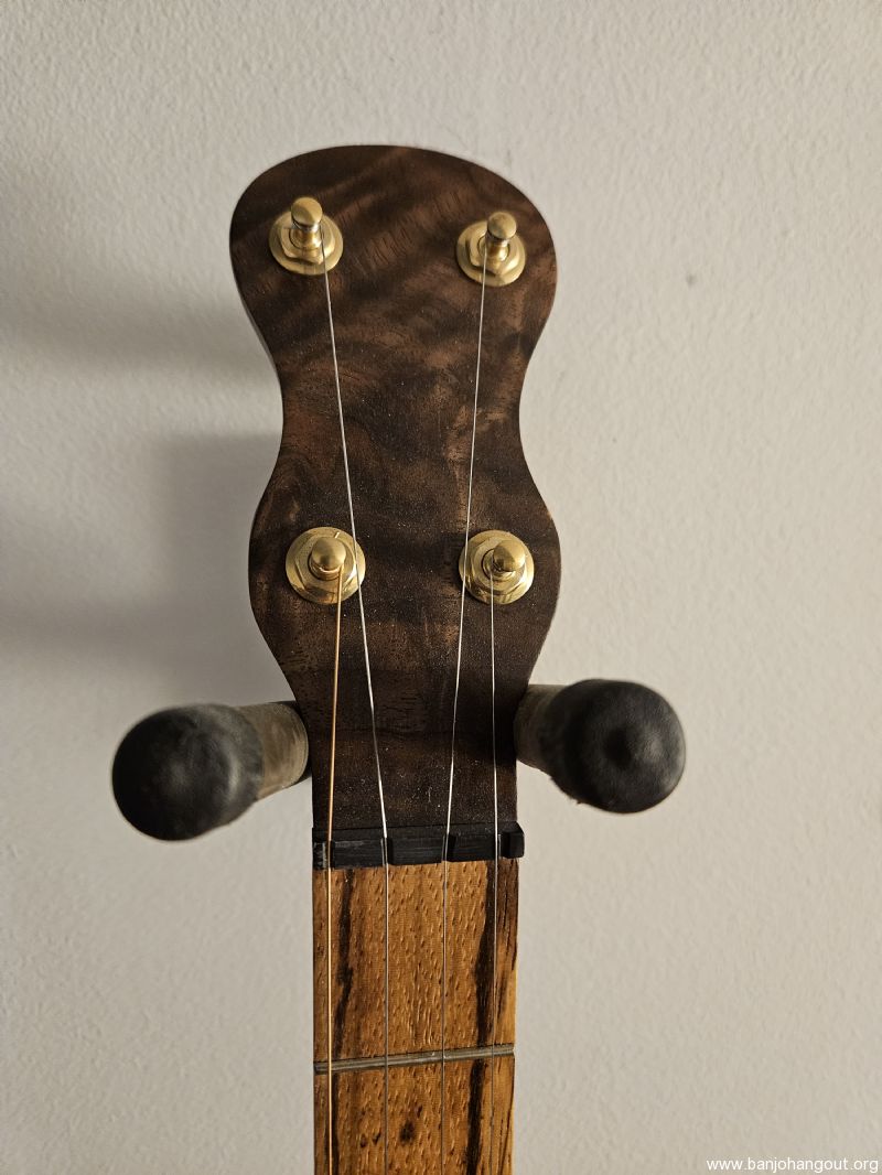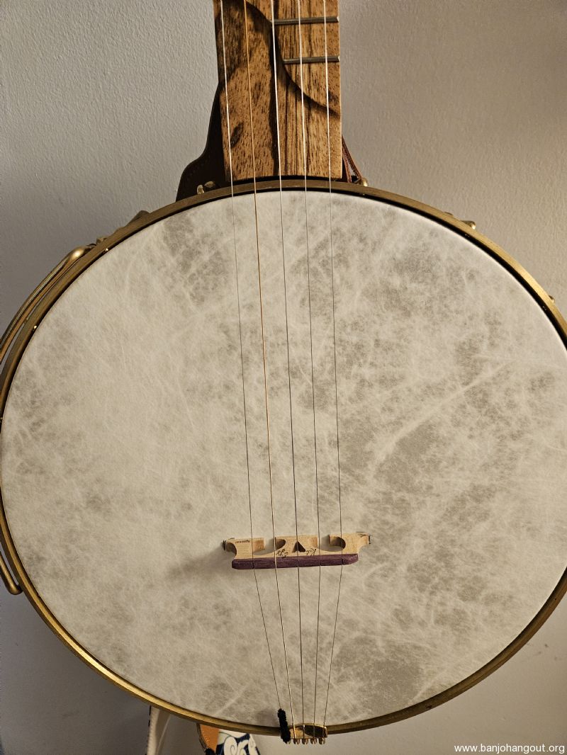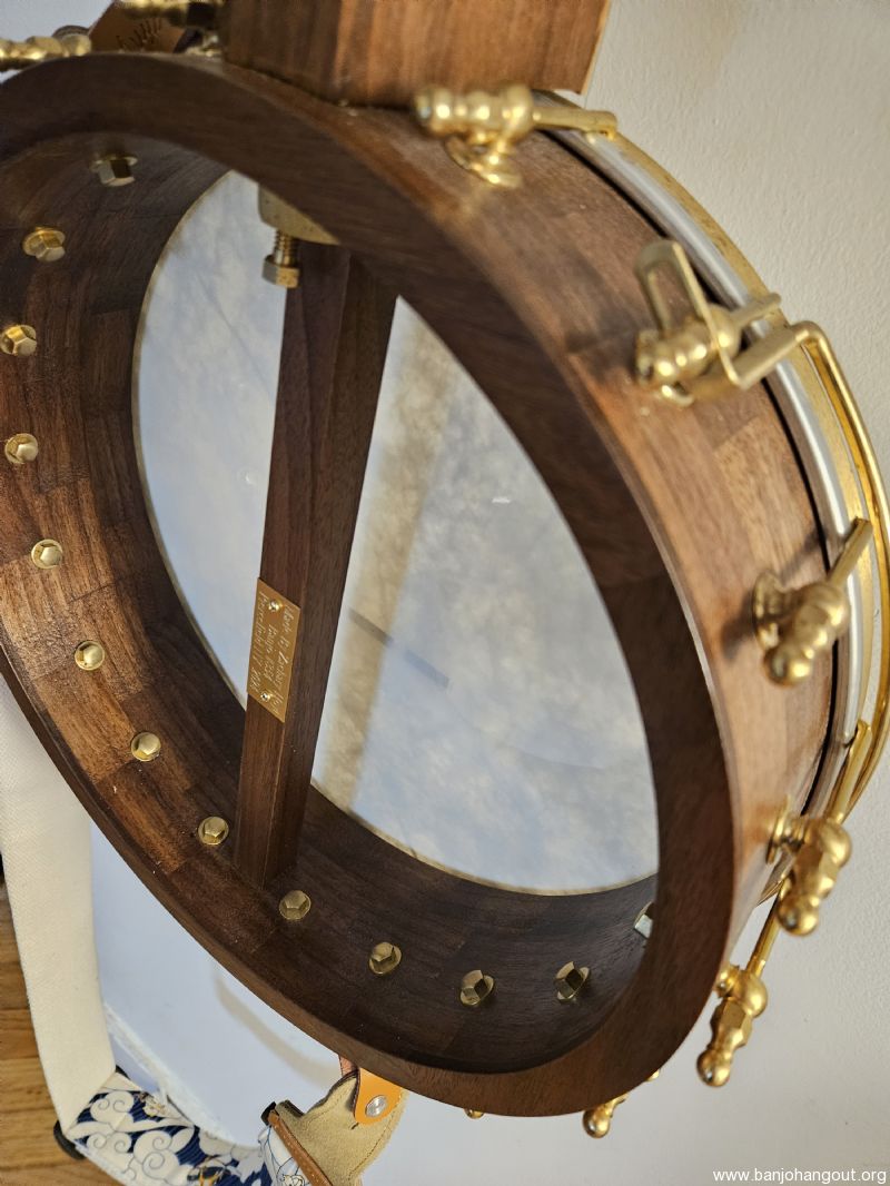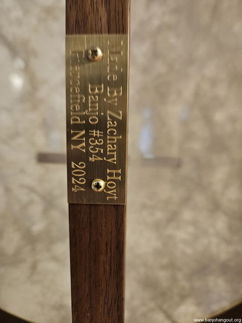 I bought this beauty 5 months ago from Zach and replaced the Ren head with a Fiberskyn, and I love the deep, mellow, and plunky sound. I also own an 11" Zach Hoyt. I've only been playing maybe once a week for about 20 minutes, so I can no longer justify having two banjos, and the 11" serves a double purpose as a travel banjo. This 12" Hoyt has never been out of the house. I will include a Protech padded case. If you visit Zach's site, you will see the description of his #354. Notice the wooden armrest. I replaced it with the wire armrest I always prefer, but will ship the original one to you as well.