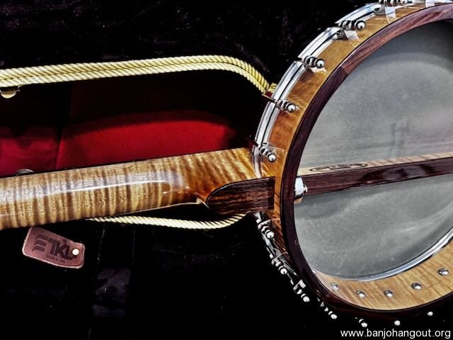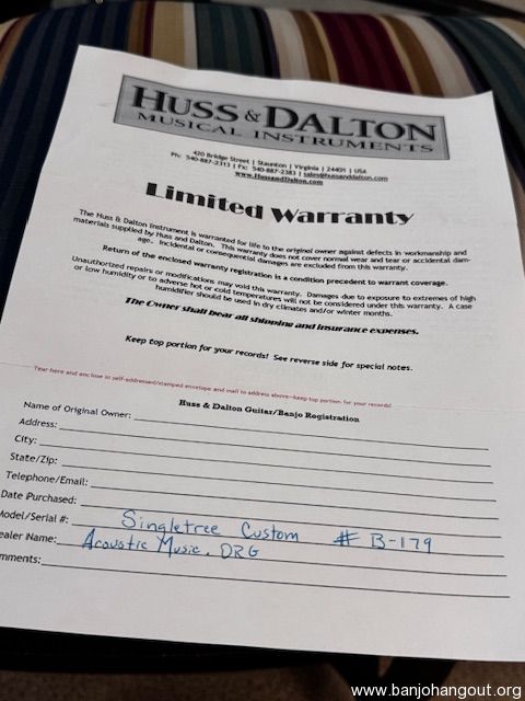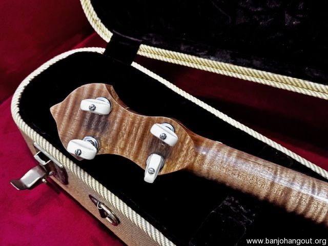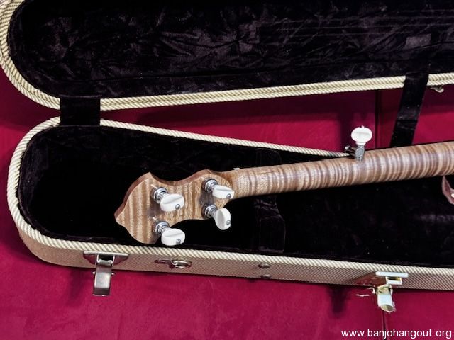 If you are interested in this banjo, you probably already know that Huss and Dalton sold the business and the new owners no longer build banjos. It’s drop dead gorgeous Mint. This is a 2011 Huss and Dalton custom ordered Single Tree 12” open back banjo. Before I bought it in doing my research, while talking to Kimberly at Huss and Dalton, at the time I spoke with her, in order to build a similar banjo for me would cost in the neighborhood of $4200.00 but they no longer had that stunning particular piece of flamed maple. As best she could remember, they only built around 5 banjos from that piece of wood. Soon after that conversation, they stopped building Banjos and sold the company. This banjo was sold as a custom order from a music store for $2700.00. It has a 1 5/16” bone nut, 25.4” scale. Custom upgrades include a Whyte Lady Tone Ring, Imperial Flamed Maple neck and pot, Custom Sterns Hide head, Ultra gloss finish, Ebony fretboard, Rosewood capped truss rod, rim and heel, Rr Spikes at frets 5 and 11. Mint Huss and Dalton Tweed TKL case with logo and an upgrade tail piece. This is an heirloom quality Banjo that you can’t get any longer. Also included is the original warranty card showing it was custom ordered by “Acoustic Music Works”. It plays and sounds awesome as you’d expect from a premier Huss and Dalton instrument.