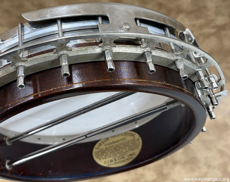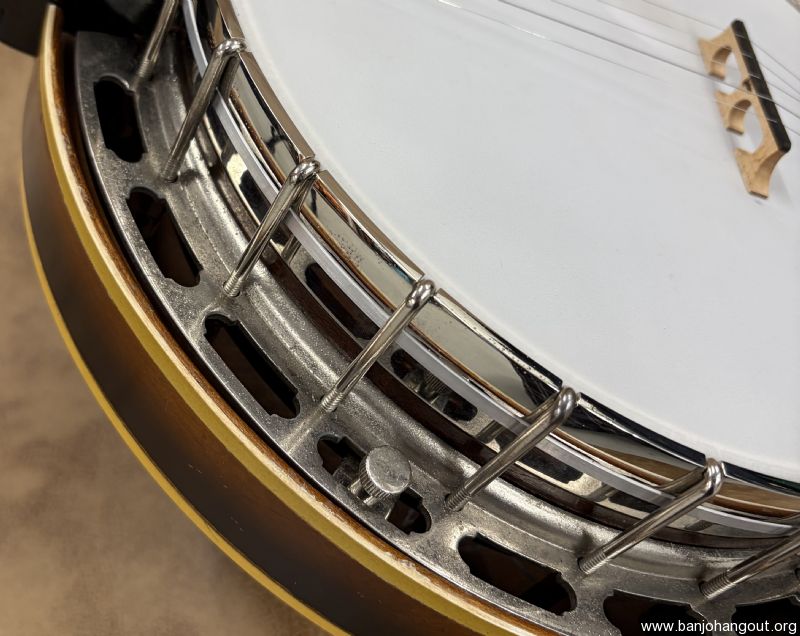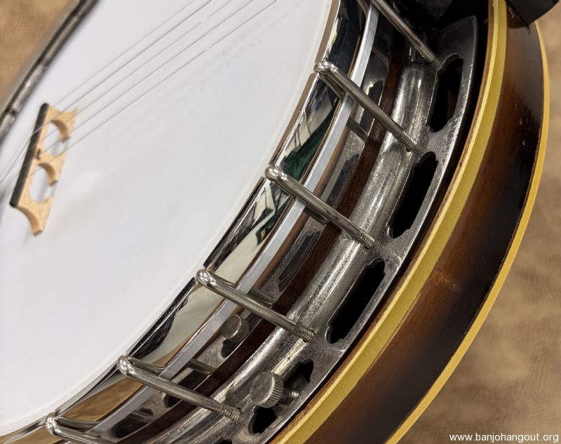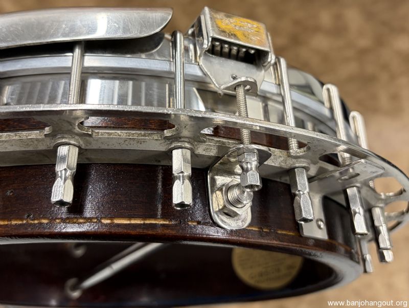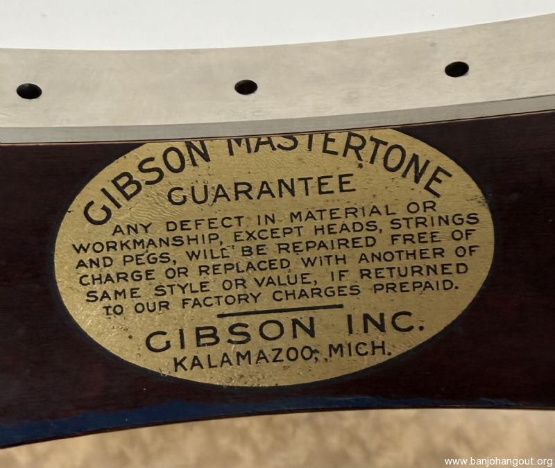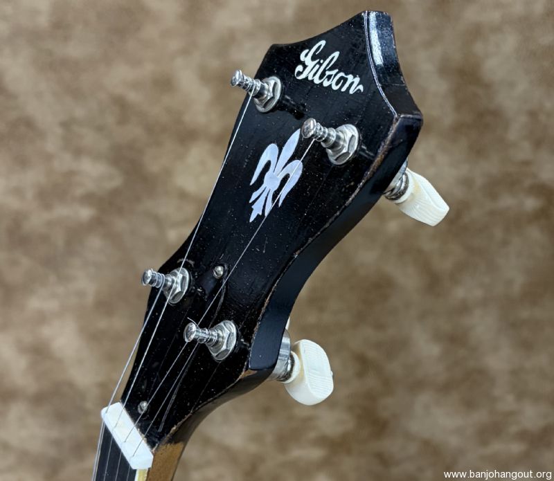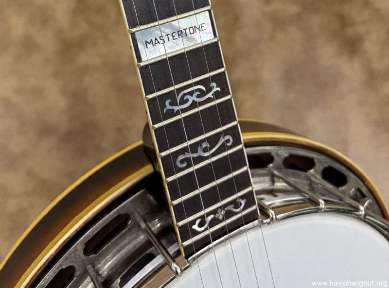 This 1930's original 5-String RB-00 has undergone an extensive upgrade to Mastertone status. The neck was inlaid by David Foster to a wreath pattern with a fleur-de-lis in the peghead without fret board removal or overspray. Sullivan "pancake" tuners added. The original rim was the "thin" configuration and has been replaced with a 1929 Gibson F.O.N. 9270-32 rim from a 2-pc flange Style 3. The rim was refitted to fit the original 00 flange by Steve Huber and is fitted with a Ceres 20-hole tone ring. The balance of the hardware is Prewar Gibson. The original resonator has binding added on the front also at Huber Banjo's. If you have any questions or desire additional pictures, don't hesitate to ask.