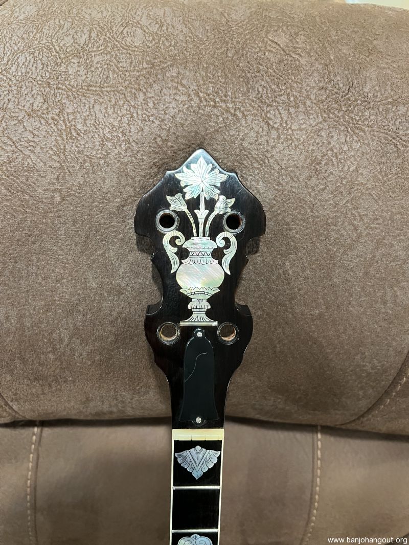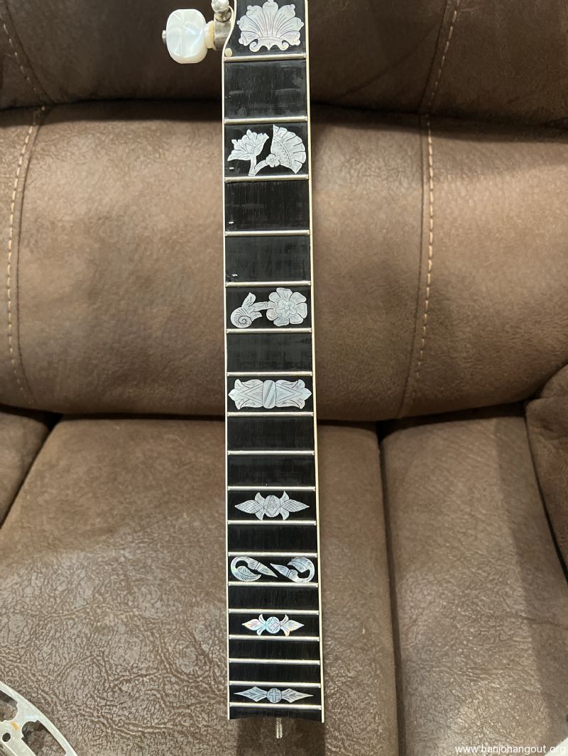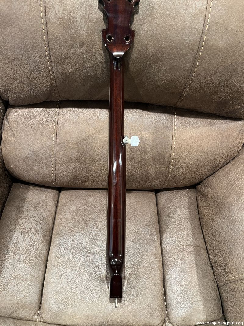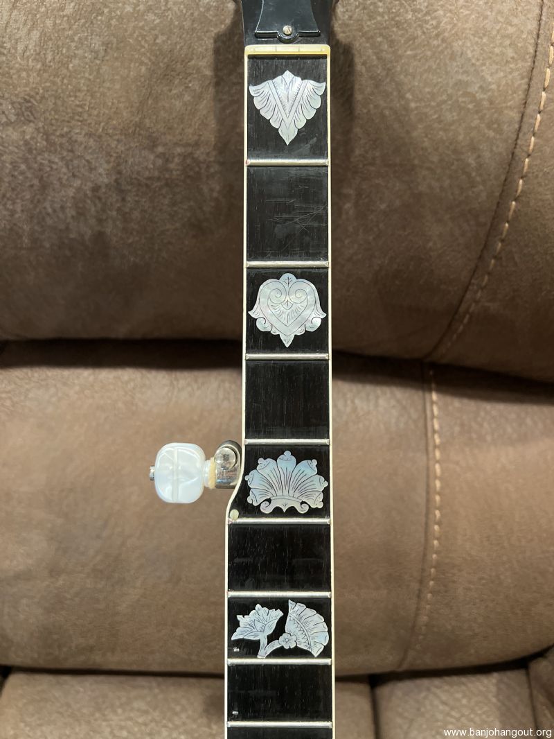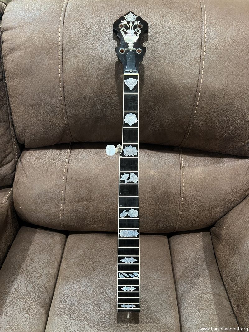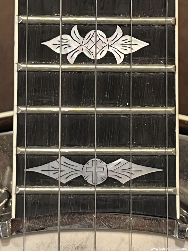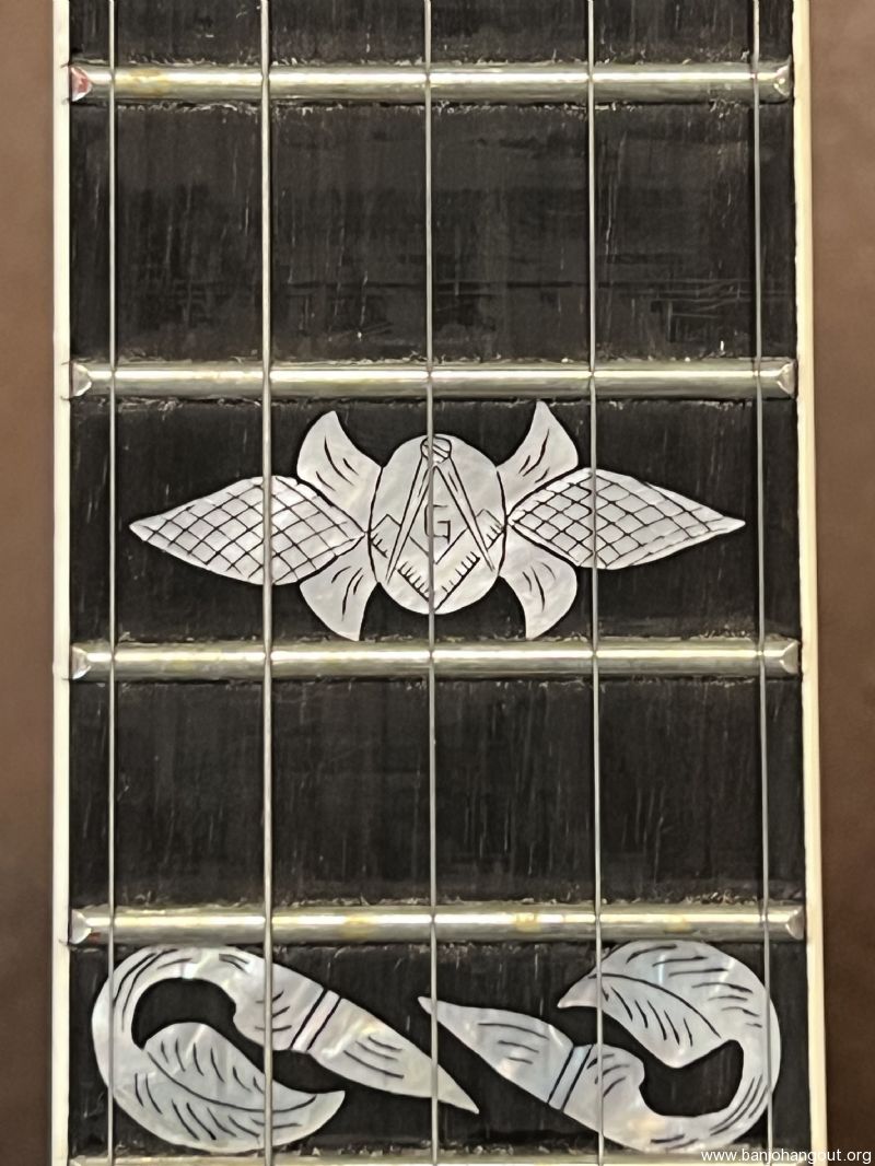 Mahogany neck by the late Don Wilson. Features a Gibson-type double-cut headstock and engraved Vega No. 7 inlay slightly modified to include a Freemason’s compass (15th fret) and cross (22nd fret). Very confident this neck has the most pearl I have ever seen on a neck.