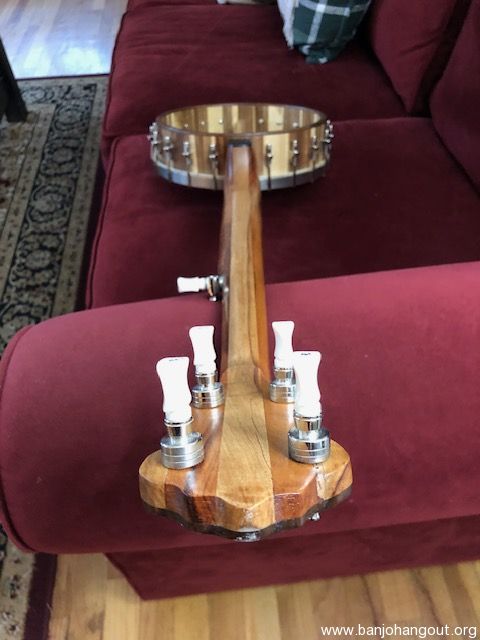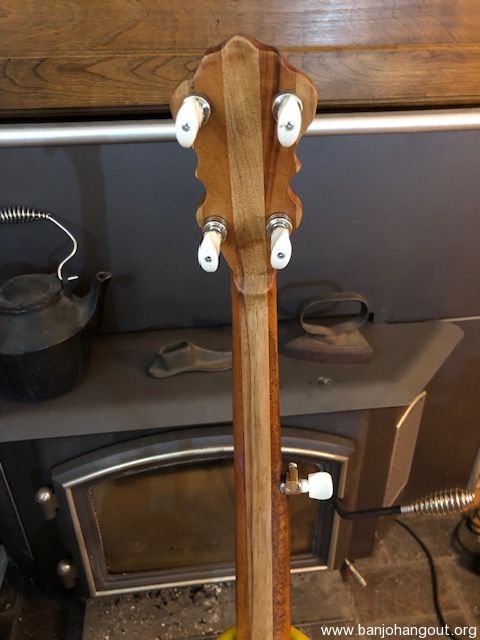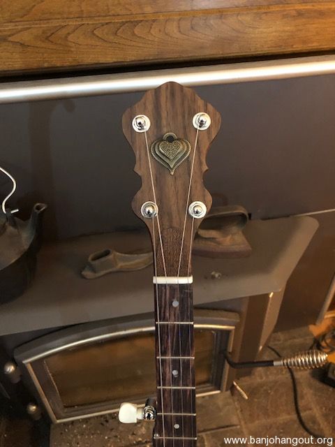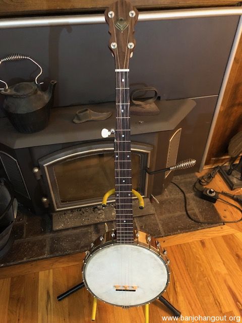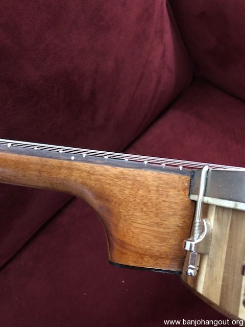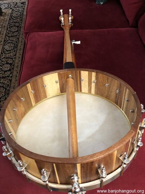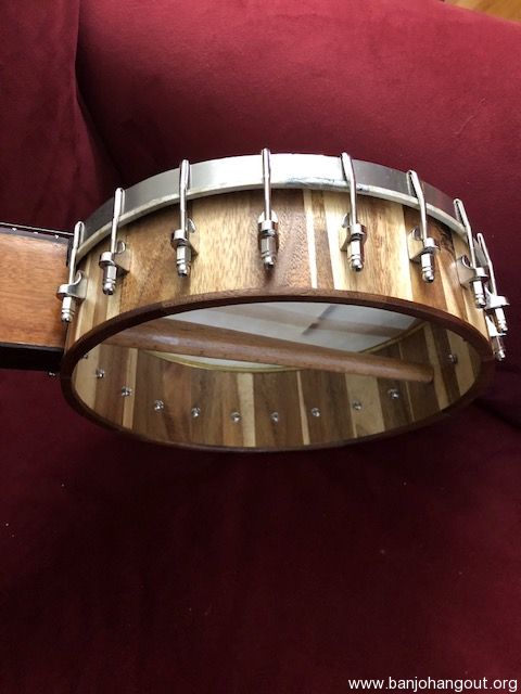 Nice open back banjo. All new parts except for the vintage 10 1/2 inch tension hoop which sits on a 1/4" round brass tone ring. Head is goat skin. Sounds good, plays easy with a nice old time sound. The pictures tell the tale. You can listen to this banjo being played by me by clicking on the link below. There is no case, but the banjo will be packed carefully and shipped insured via UPS Ground.