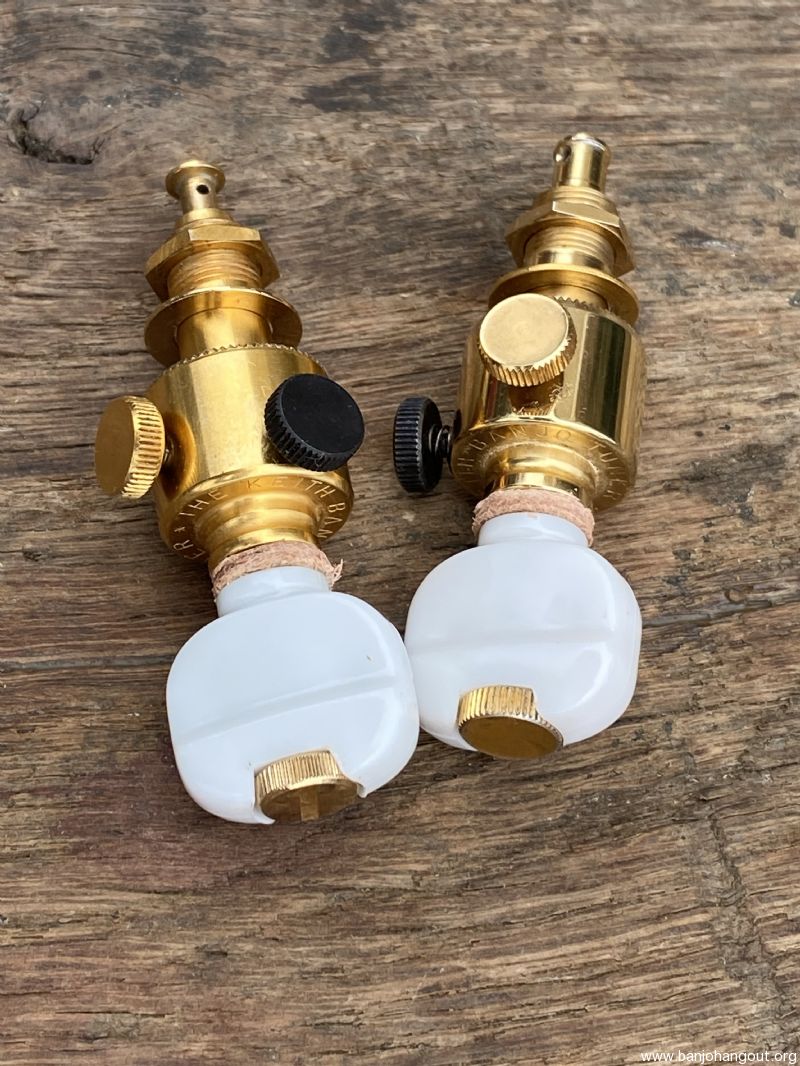 Nice pair of gold plated Keith tuners for 2nd and 3rd strings. Plating is a little deeper on one tuner but was not noticeable when on the banjo.