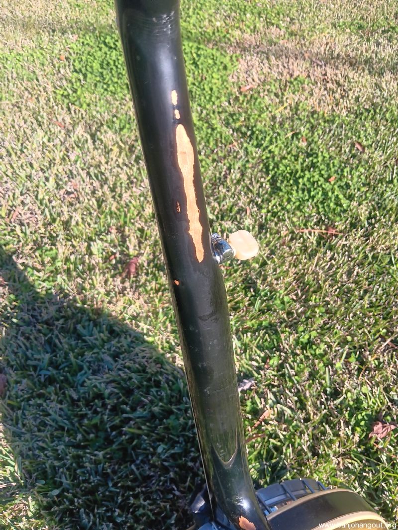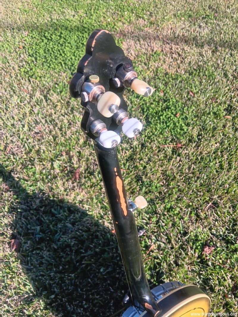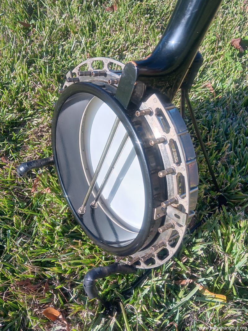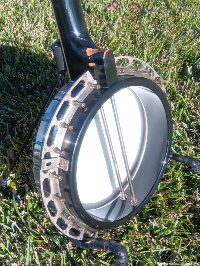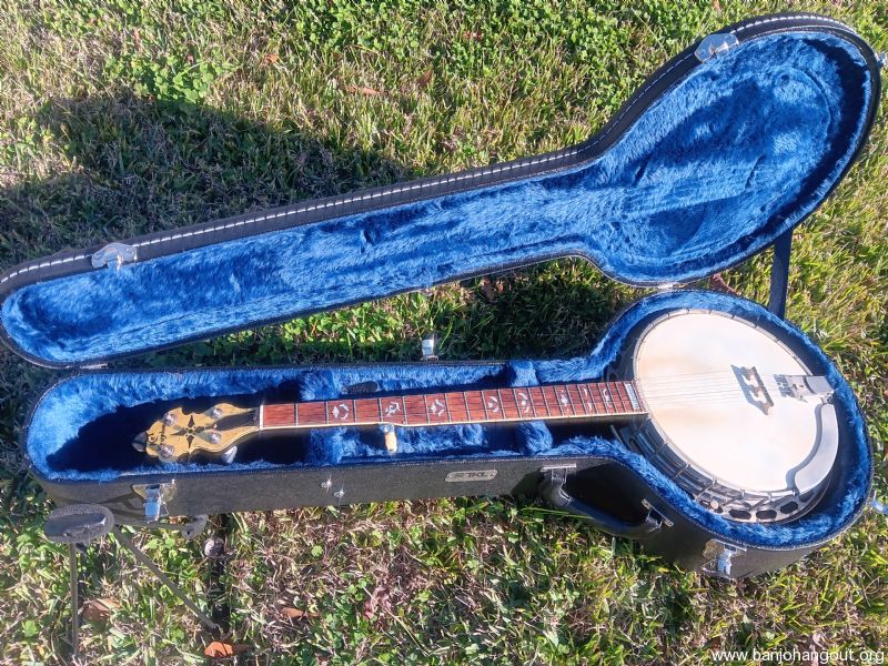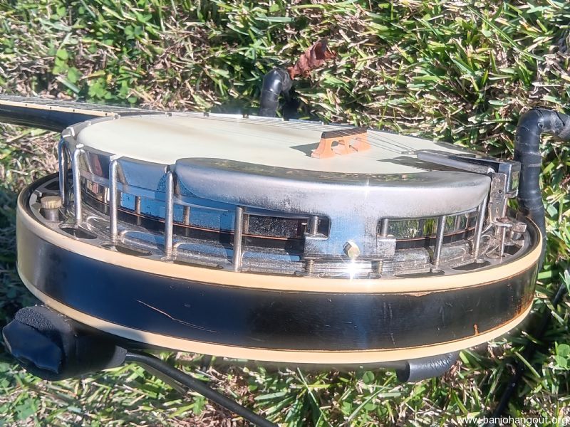 This older conversion was put together by Rual Yarbrough. It has a Randy Wood straight grain maple neck. The tone ring is a nickel plated Richard Kulesh Sr. 20-hole flathead. Keith D-tuners included!