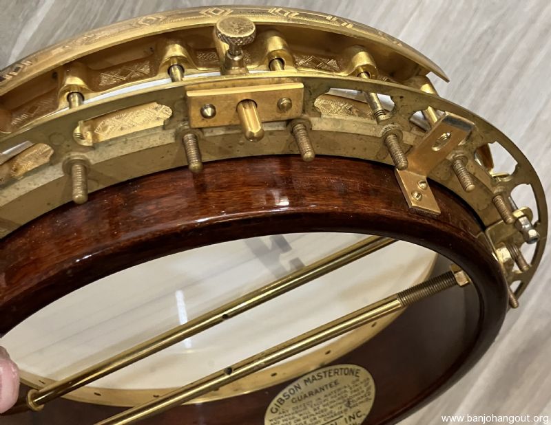 For several years the Gibson company was no longer producing a gold plated banjo until the advent of the Style 18 in 1937. The 18, along with the 7 and 12 were the new top-tension design. This banjo happens to be the very first