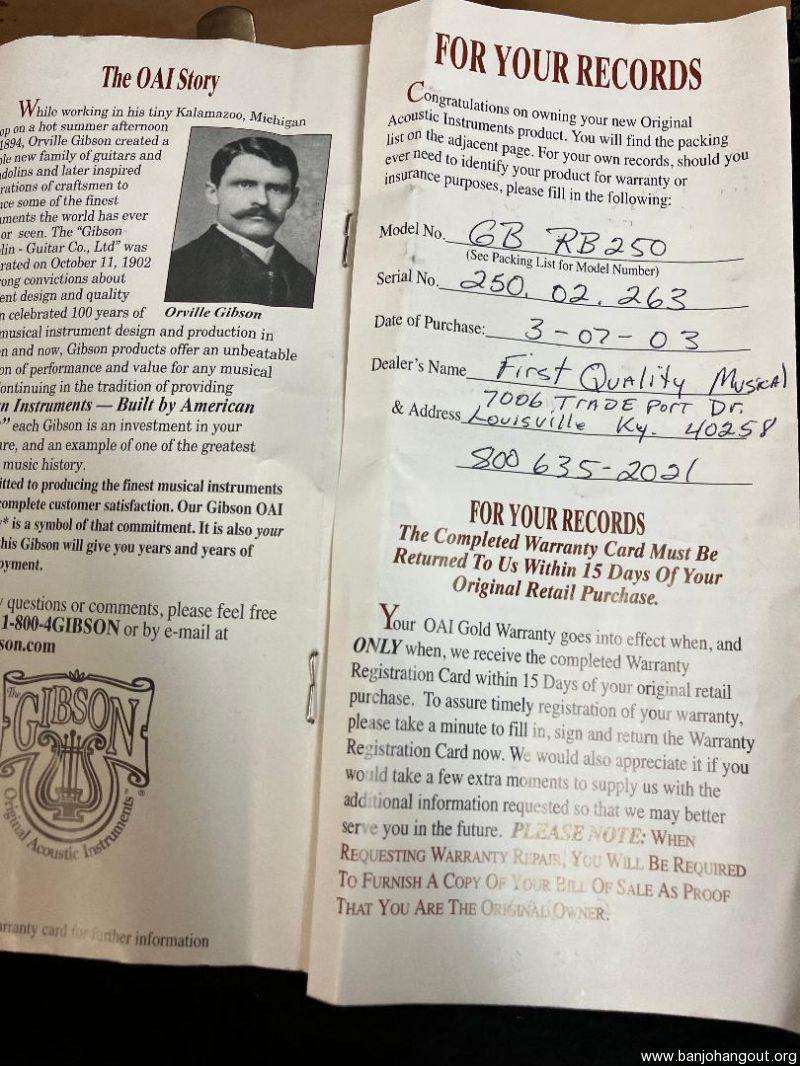 2003 Gibson RB-250......All original jncluding Gibson case......No spikes or any kind of 5-th string capo was ever install so it indicates very little playing......