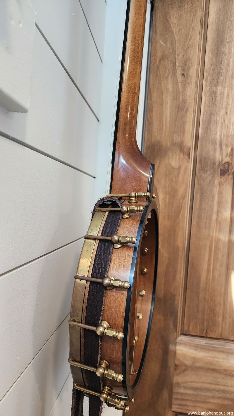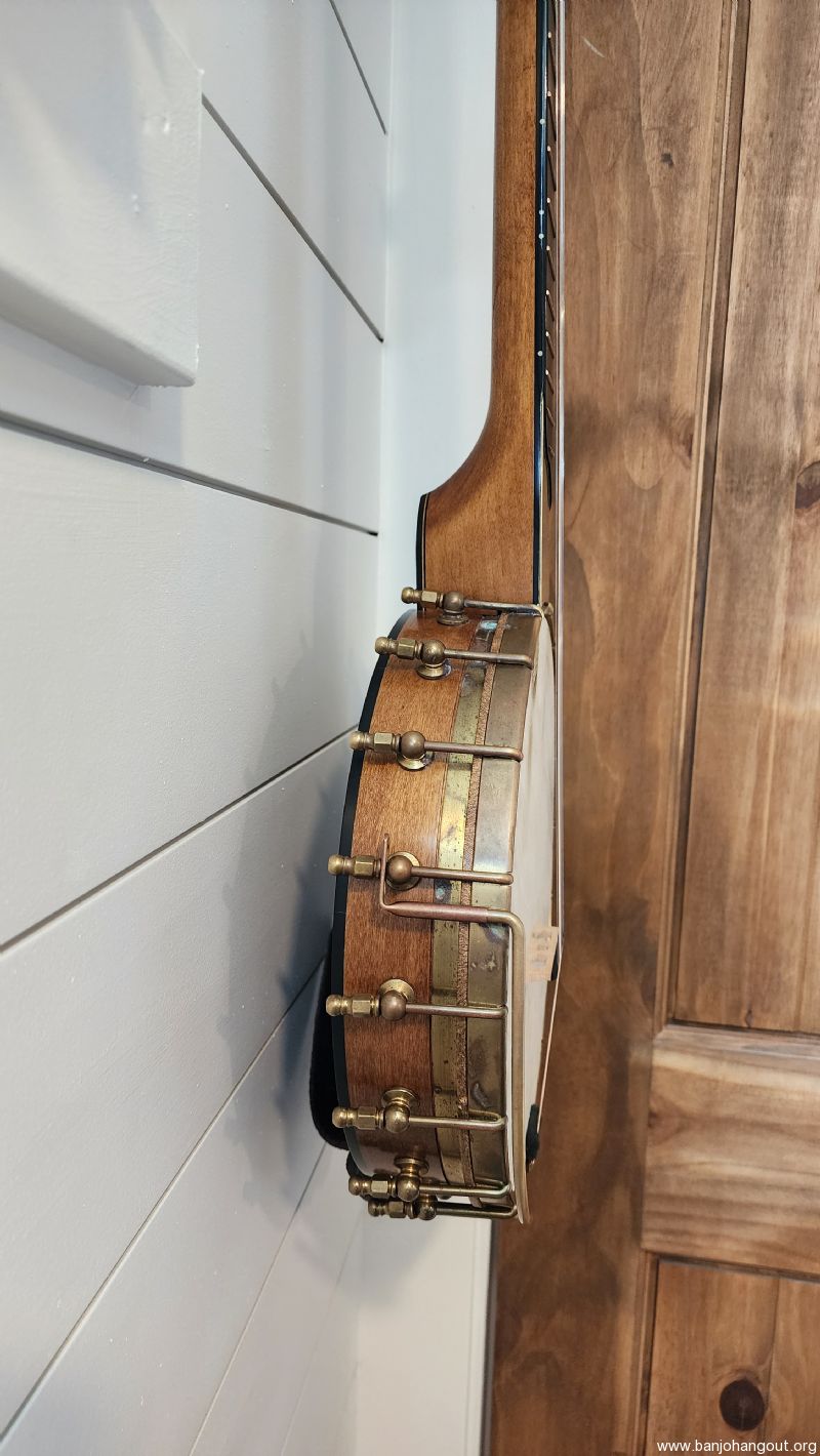 No significant damage anywhere on the banjo but does have some brass patina (which could be cleaned up if desired). The strings were recently replaced with a new set of Pisgah Old Time Clawhammer medium strings so its ready to play. Strap not included. No case but banjo will be packed very well.