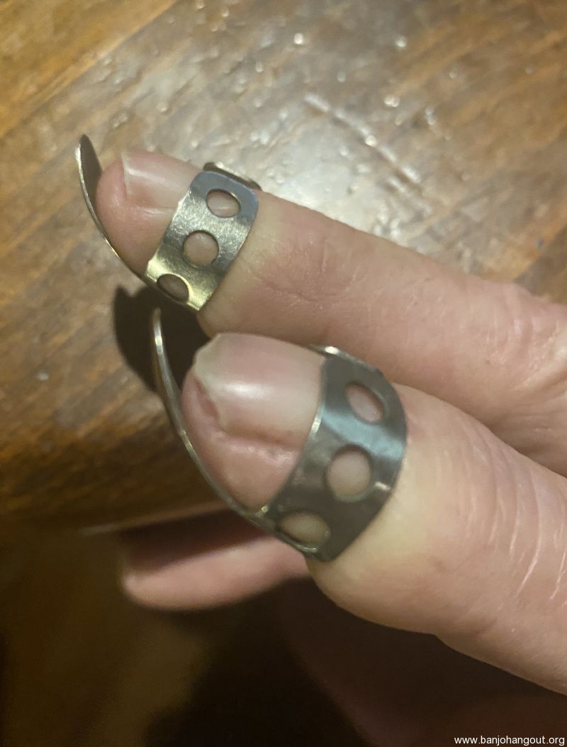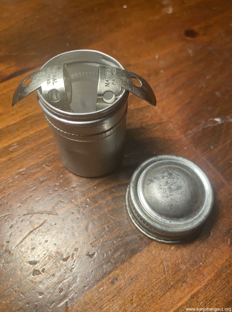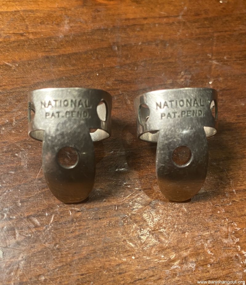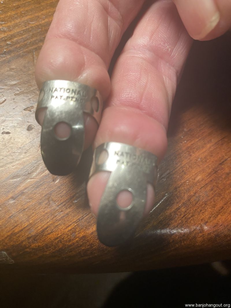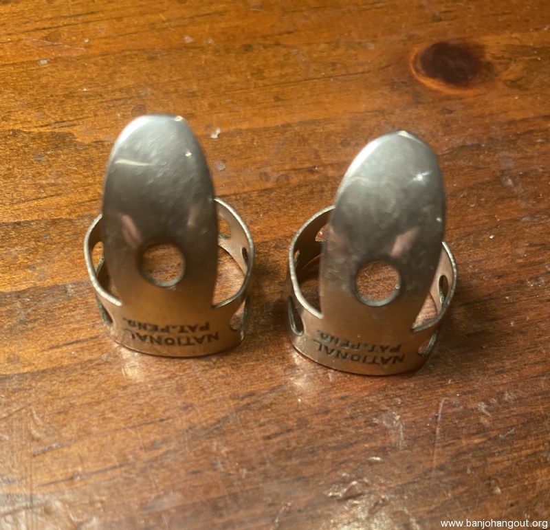 one Pair of National Pat Pending fingerpicks. No breaks anywhere. Smooth as glass on a string. Firm Price,,No Trades considered.....4% if paypal Comes in Canister ,,,Pictures do not do them justice.,,