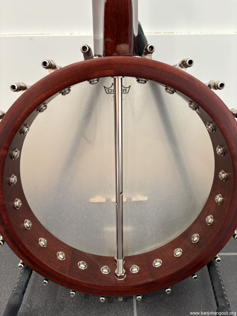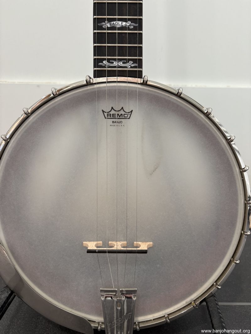 Professional-grade clawhammer banjo built in 2022, lightly used and in beautiful condition. Upgraded with Rickard Cyclone 10:1 tuners and Remo banjo head. 11-inch pot. 26 1/4 scale. Solid maple (mahogany-stained). Includes hard-shell case, stand, Schubb capo, tuner, and assorted strings. With Deering certificate of authenticity.