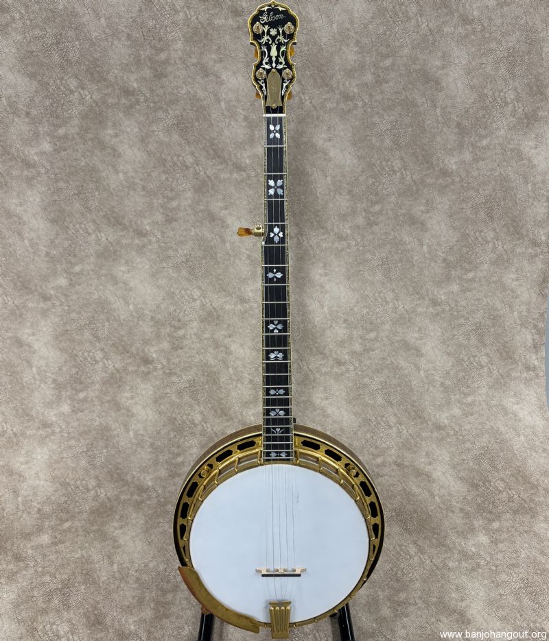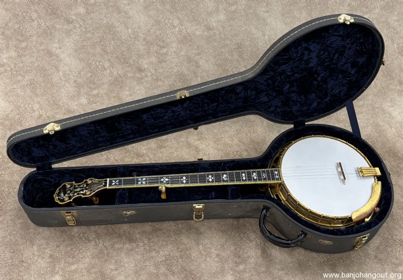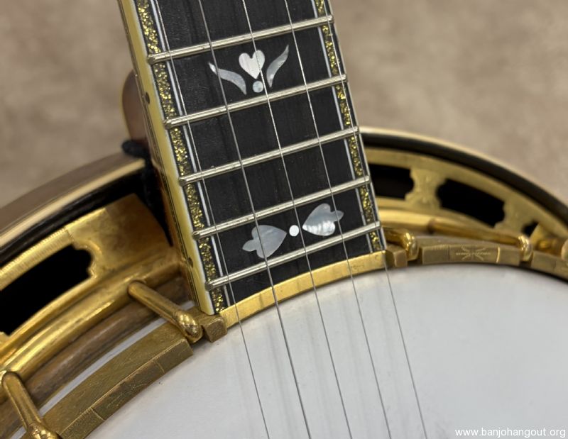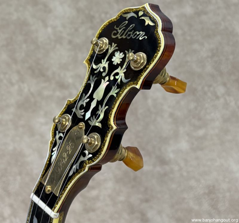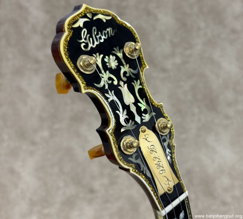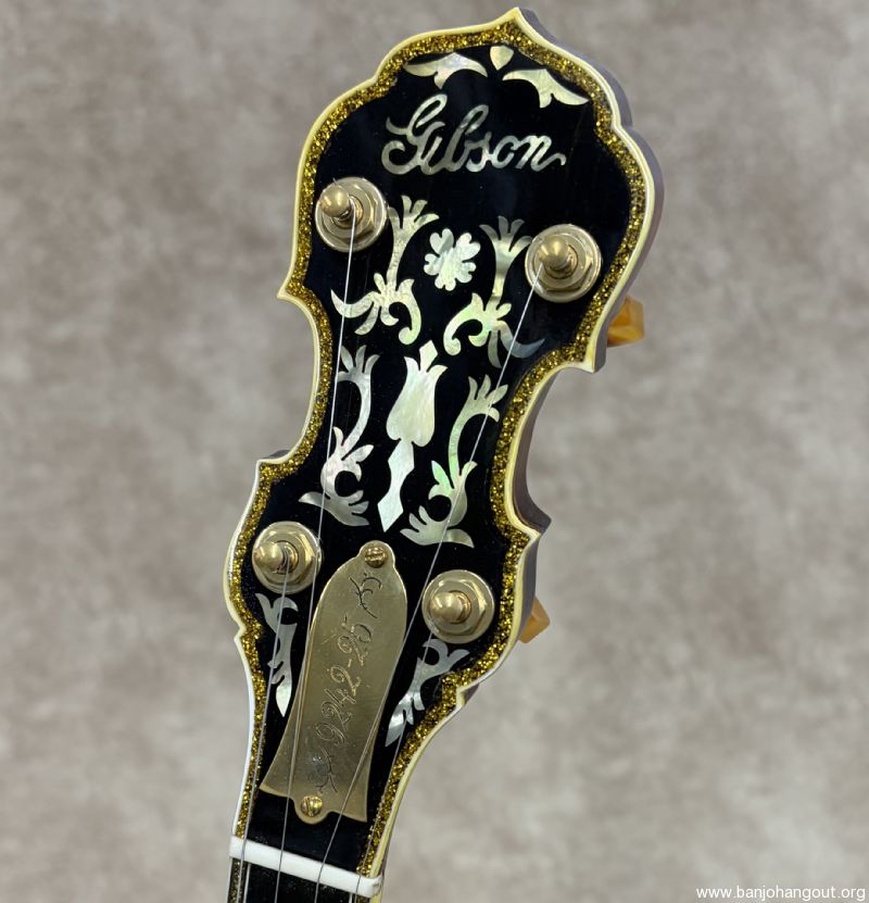 Here's a fantastic example of an Original Flathead "Sparkle 6" from Gibson in late 1928 F.O.N. 9242-25. The Style 6 was highly decorative with its gold plated and engraved hardware along with the sparkle binding. These are well known for fabulous response and tone with the lighter weight high profile flathead tone ring. These banjo's came from the factory with a "Vibrato Tone-Master" mute which was removed at some point. This one remains in beautiful condition with a new curly maple neck by Richie Dotson. The neck is an absolute stunner with a brass truss rod cover customized with the factory order number. If you need additional pictures of have any questions, don't hesitate to ask. Thanks for looking!