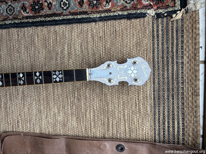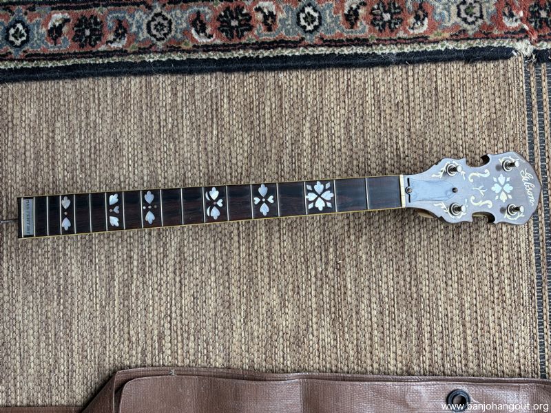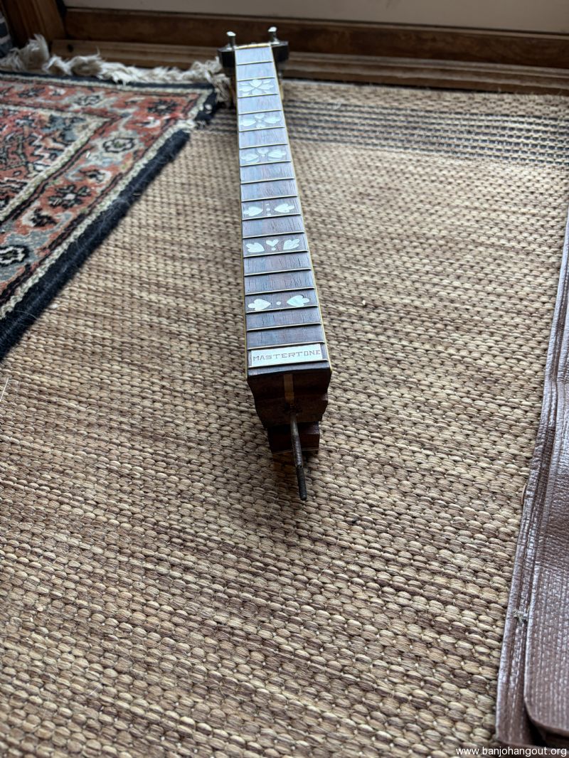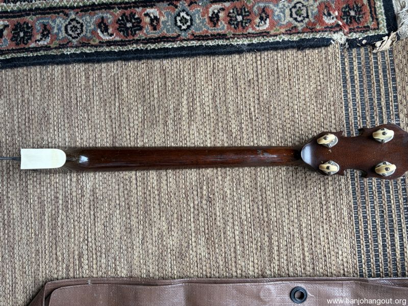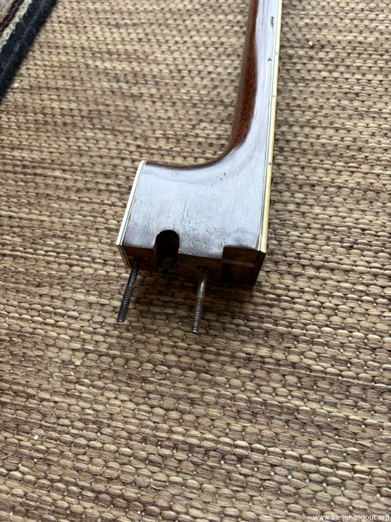 Neck from 1926 TB4 mahogany fits two piece flange, comes with original tuners and lag bolts. cleaning out stuff.