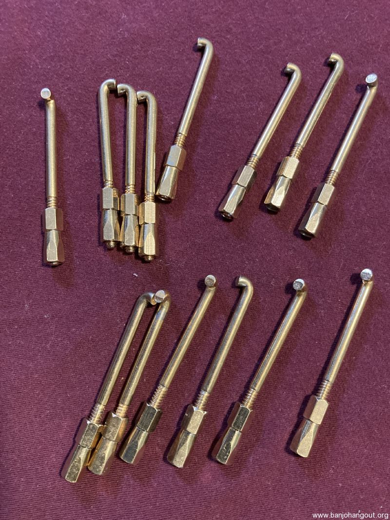 For sale, great price for this nice set of spare Gibson style hooks and nuts in great condition. Standard prewar style Gibson thread, which, if I remember correctly is 8-32. Also, these hooks are slightly rounded on the thread-end tip, similar to the pre war versions… great for replacing any corroded, peeling, or worn J hooks!
