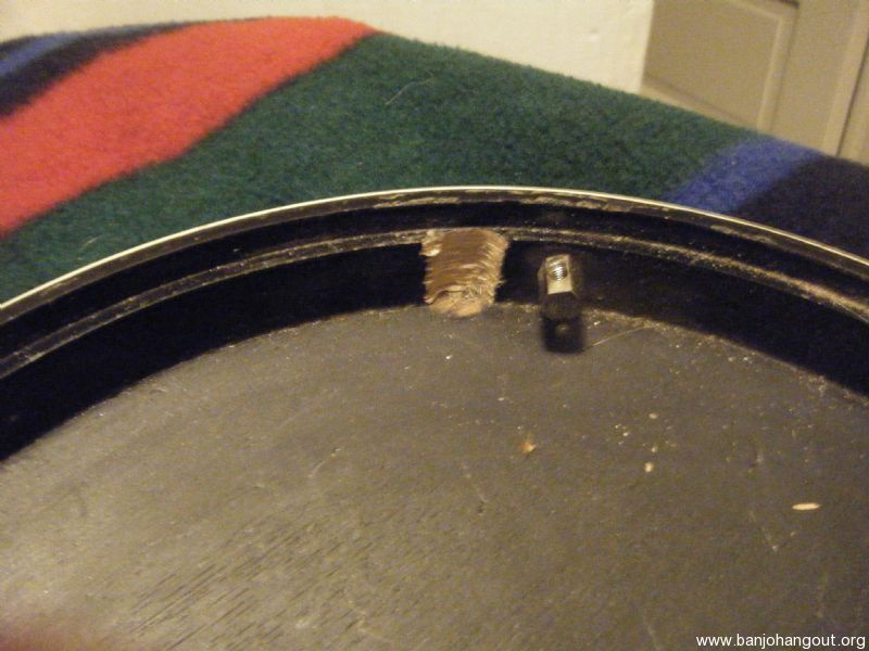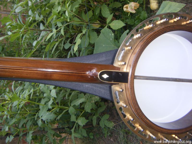 Gold plating is almost gone except on the Ode tailpiece, so mostly nickel now shows. Banjo has a few dings and scratches, one small one goes thru the finish and marks the wood. Every ding or chip that photographed is included in the pictures. Hard shell case. Of course very good sound, I now understand why Bobby Thompson played a Baldwin. I consider this in VERY GOOD condition, but downgraded it to GOOD, for anybody who doesn't like any dings or scratches, because the gold plating is almost gone, and there is the usual tarnish on the nickel. Snuffy Smith III bridge presently on it. . Serial number 738, made in early 1968, one of the last six Style D's made in Colorado. Original armrest was not on the banjo when I bought it, I put a Nechville armrest on. Must have had an pickup on it, as a 3/4 inch wide channel less than 1/4 inch deep has been carved out of the inside of the side of the resonator to let wires through. You cannot see this when resonator is on. I assume a set of very small holes on side of neck are from a Schub capo. Someone has at one time had the banjo miked and carved a small place for the chord to rest (or whatever it does) into the inside of the side of the resonator. Flange entirely covers this up so cannot be scene. Last pic (just added) is of this.